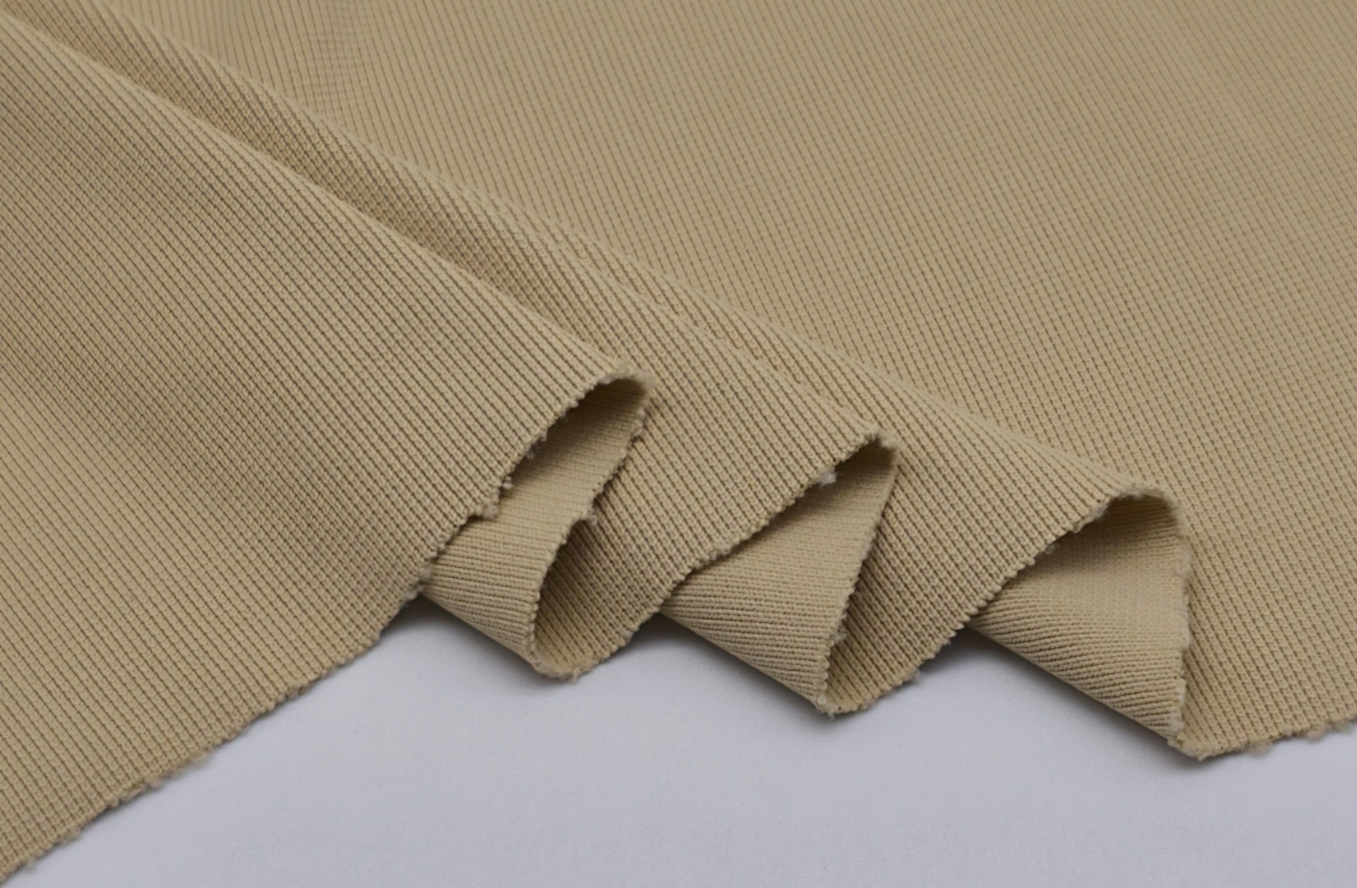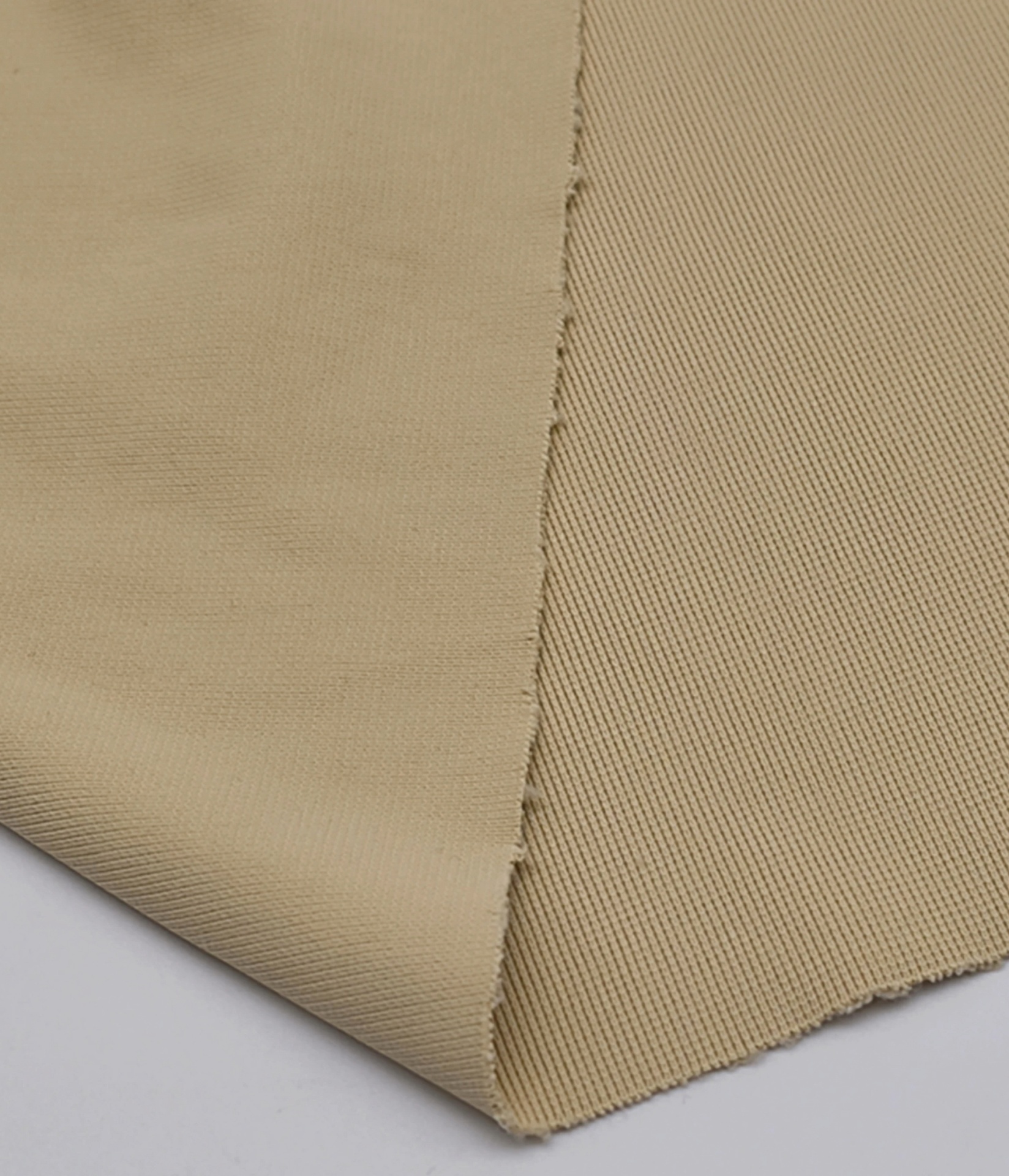 Malha no tom bege, maleável, bom caimento e boa elasticidade