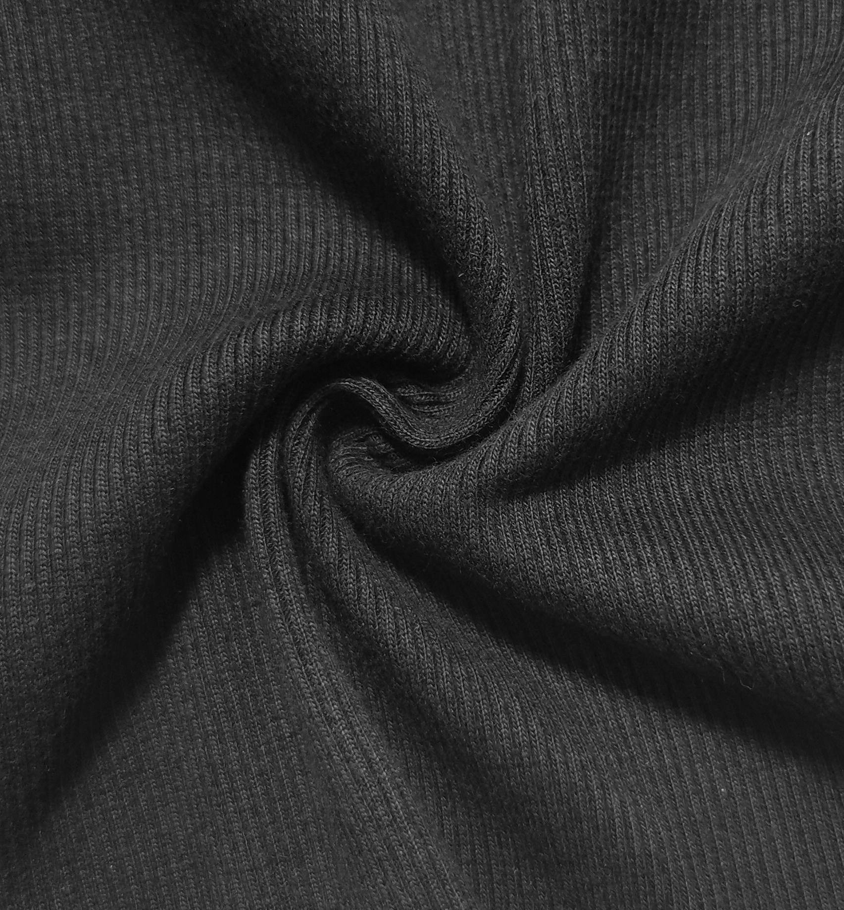 Malha canelada com elasticidade e flexibilidade, macia, bom toque, bom caimento, cor opaca, sem brilho, peso médio
