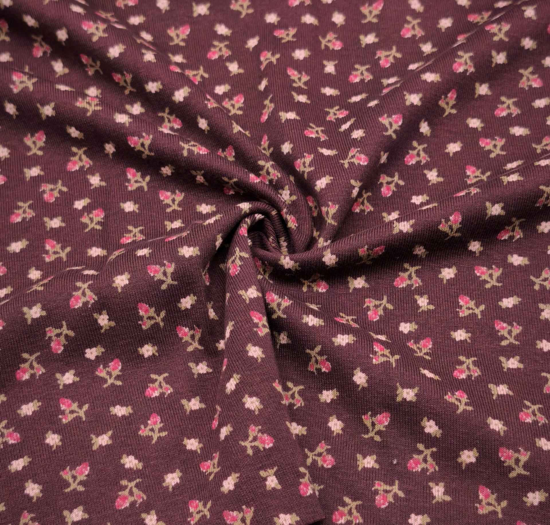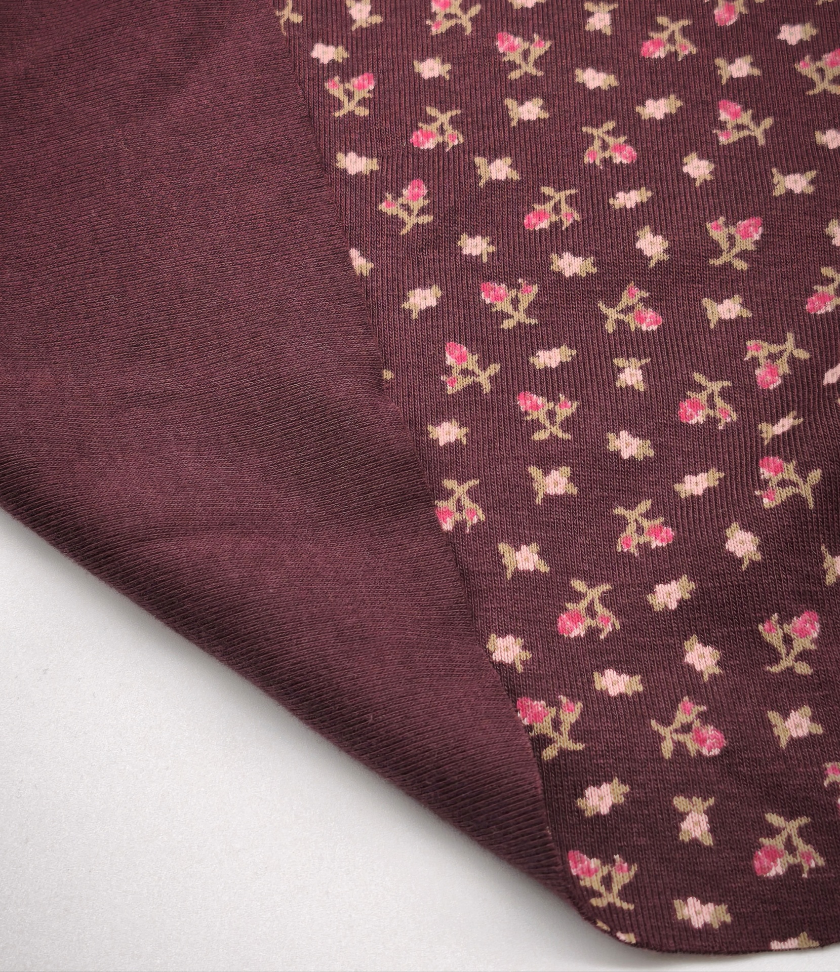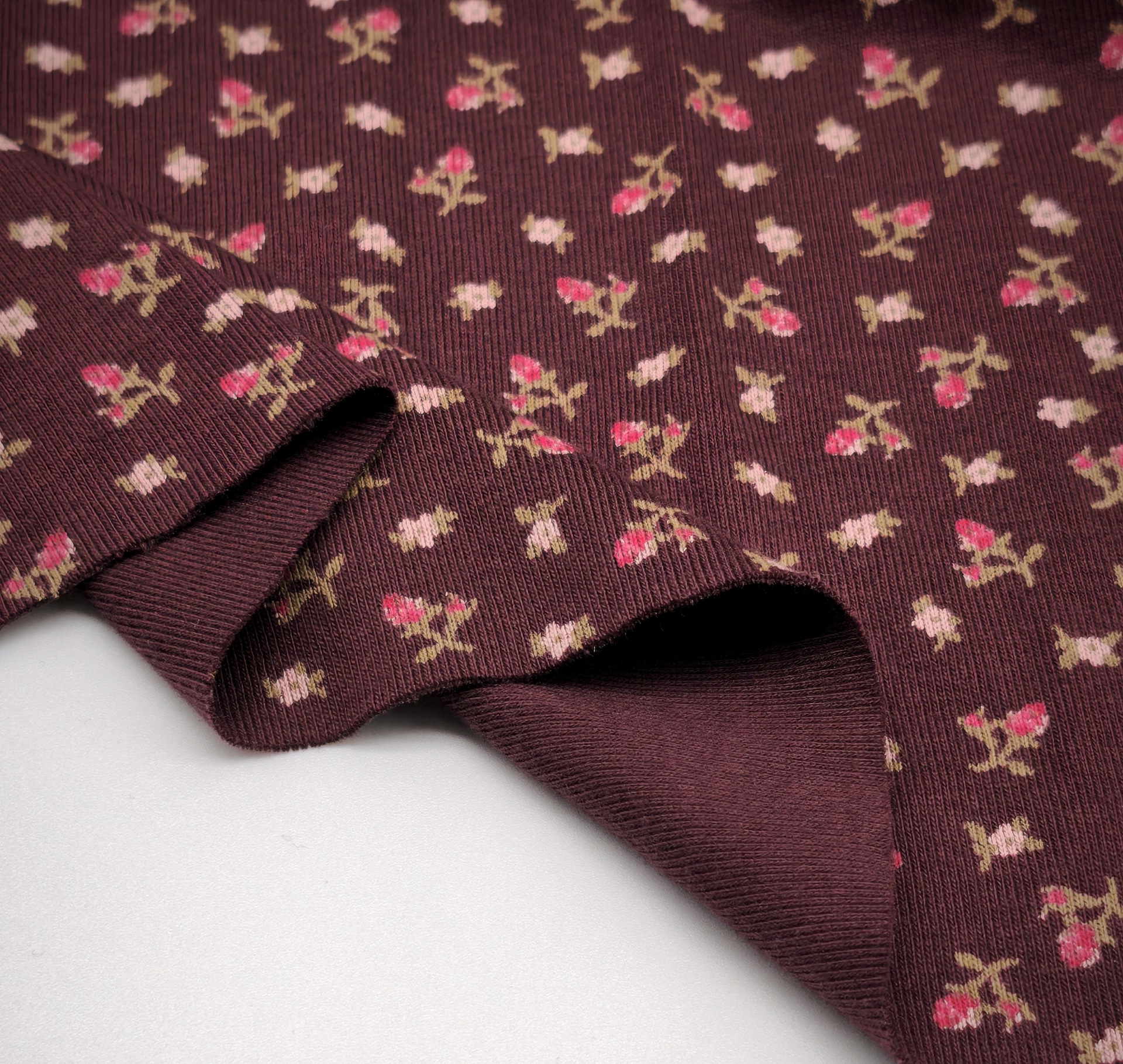 Canelado compacto, tom base cor de vinho, estampado em tons rosa claro, verde e rosa