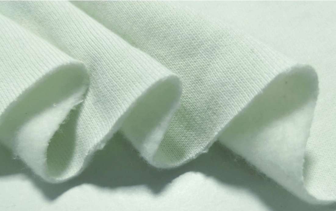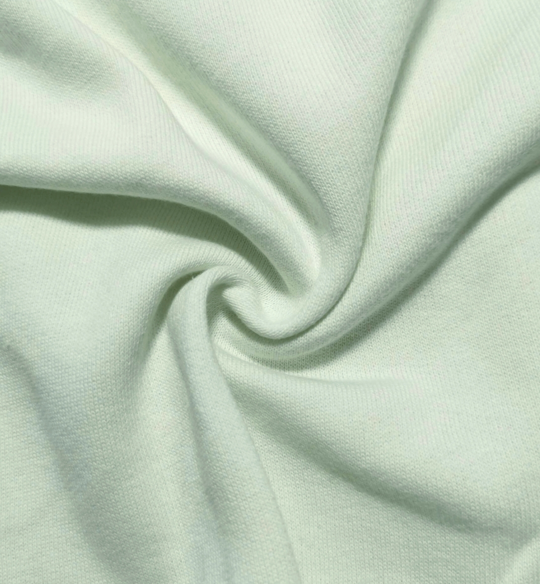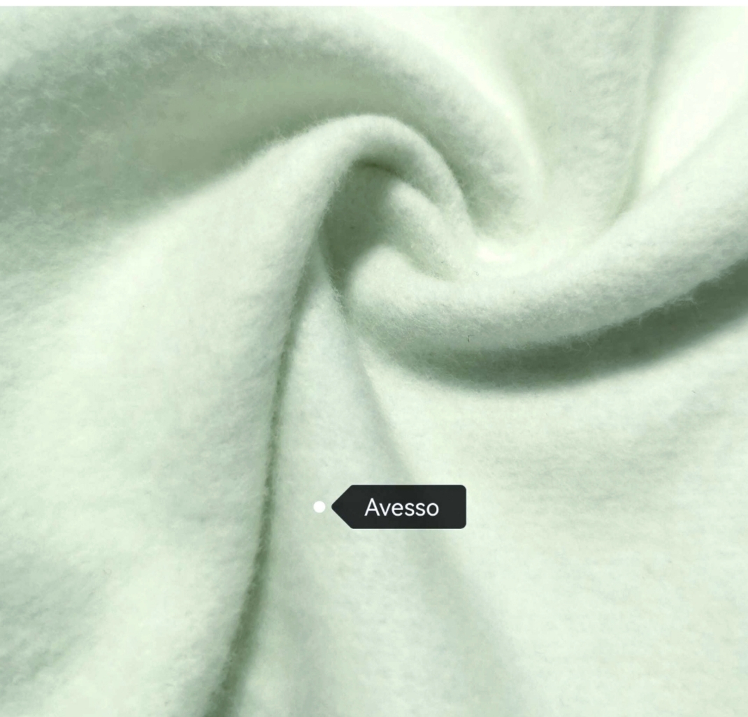 Malha de tom verde água muito clarinho, bastante confortável, macia, quentinha, maleável, cor opaca, sem brilho, sem elasticidade