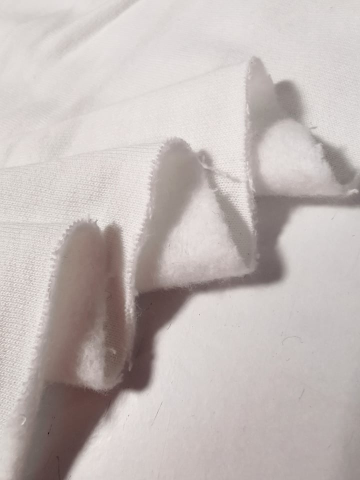 Tejido cardado, de color blanco, cálido, suave, maleable, color opaco, sin brillo, sin elasticidad.