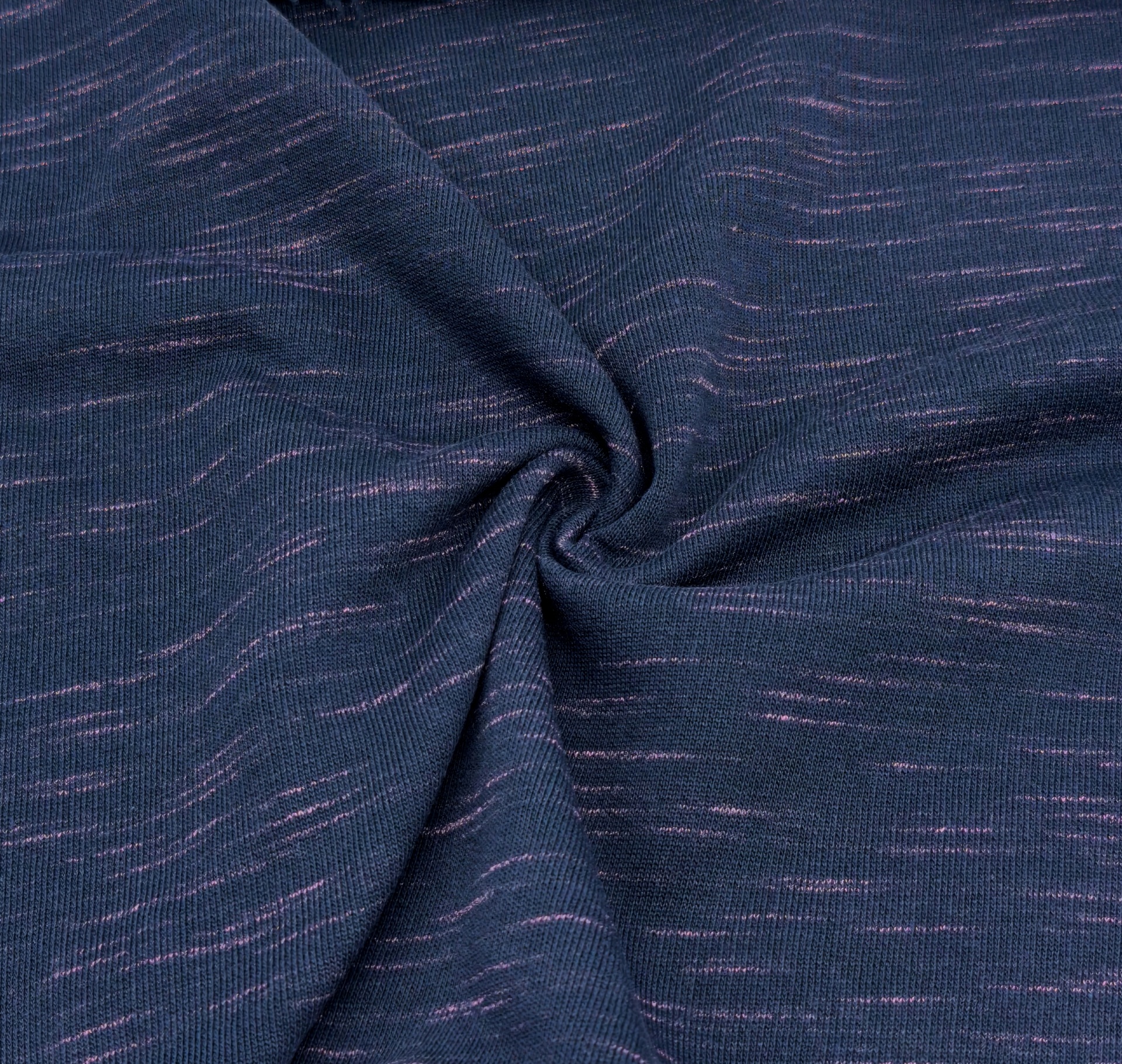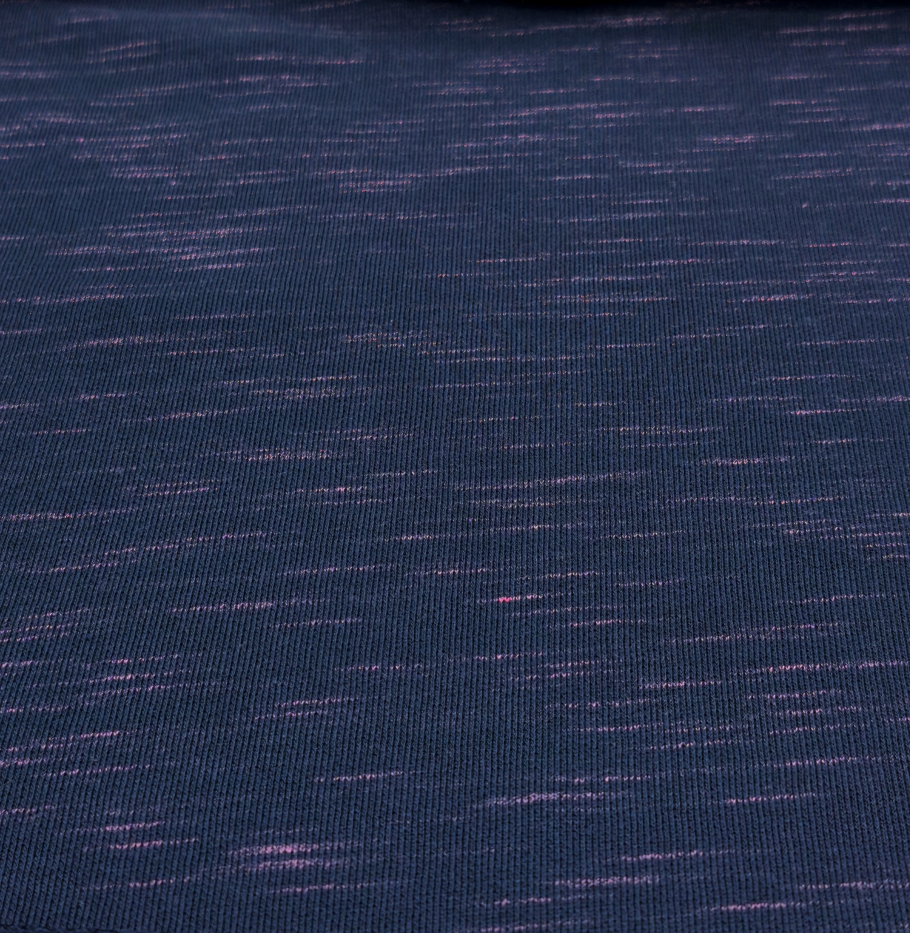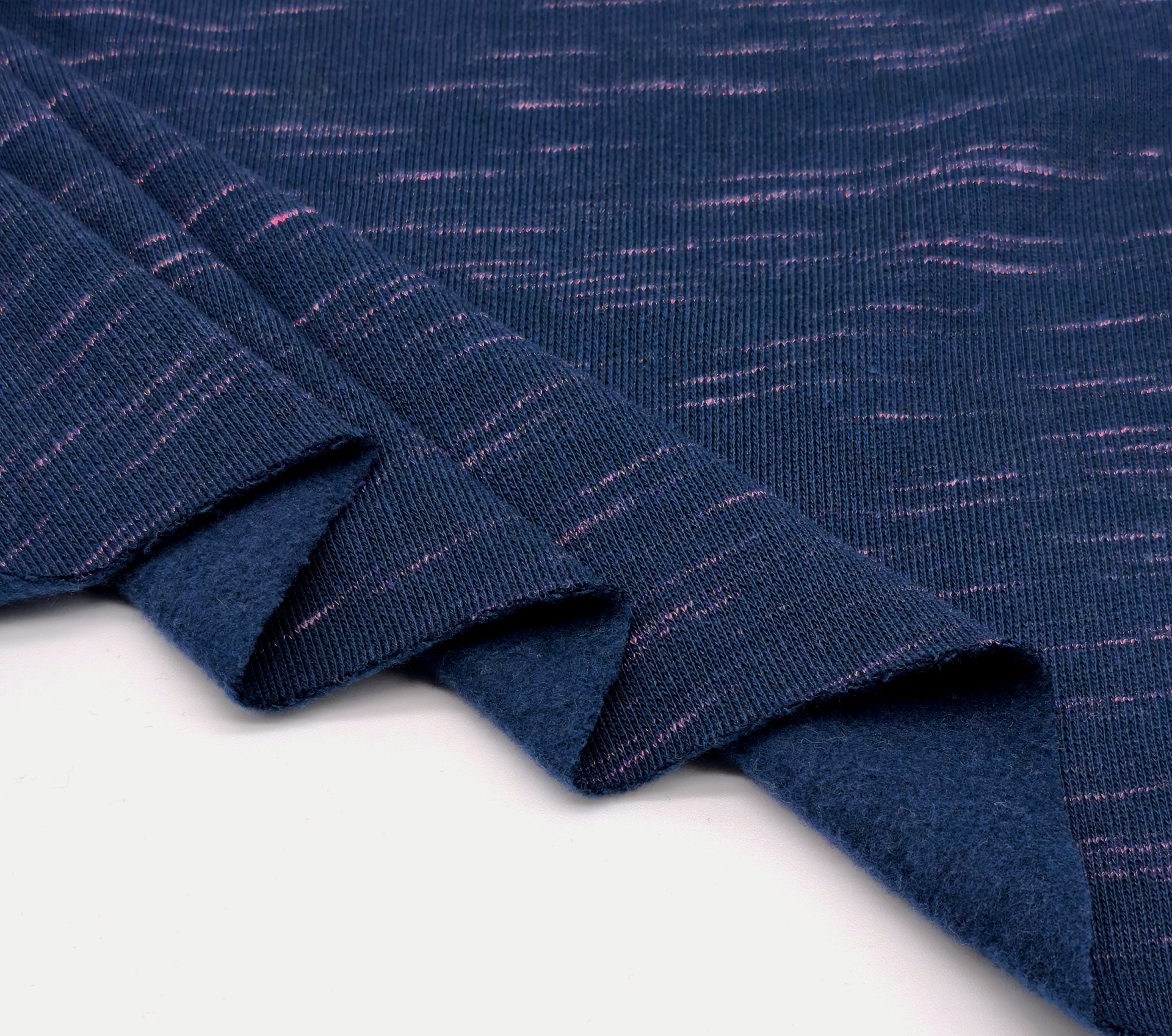 Malha em tom azul marinho com fios mescla em tons rosa, quentinha, macia, maleável, sem brilho, cores opacas, sem elasticidade