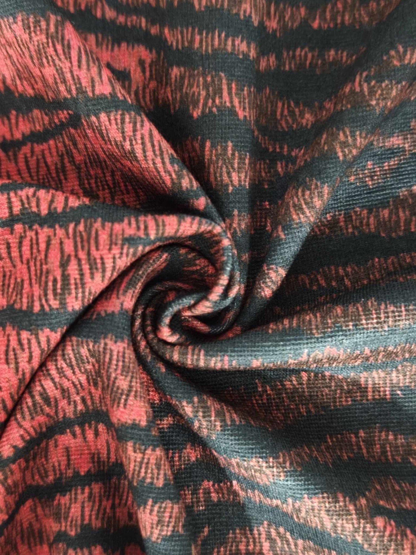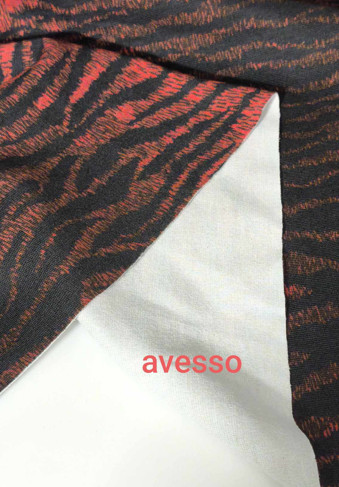 Malha de tom bordô rosado e preto, sem brilho, bom caimento e elasticidade