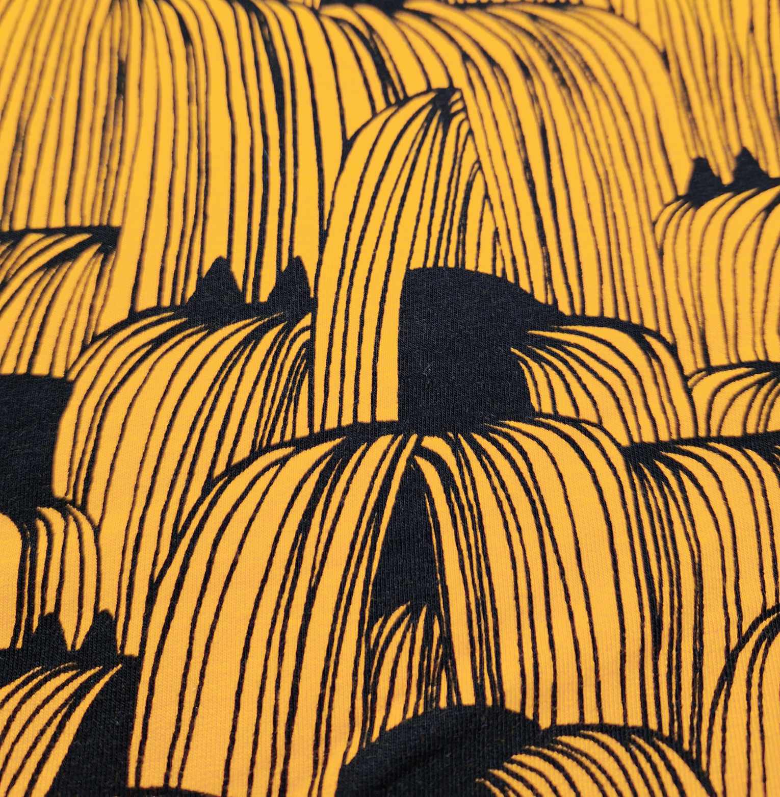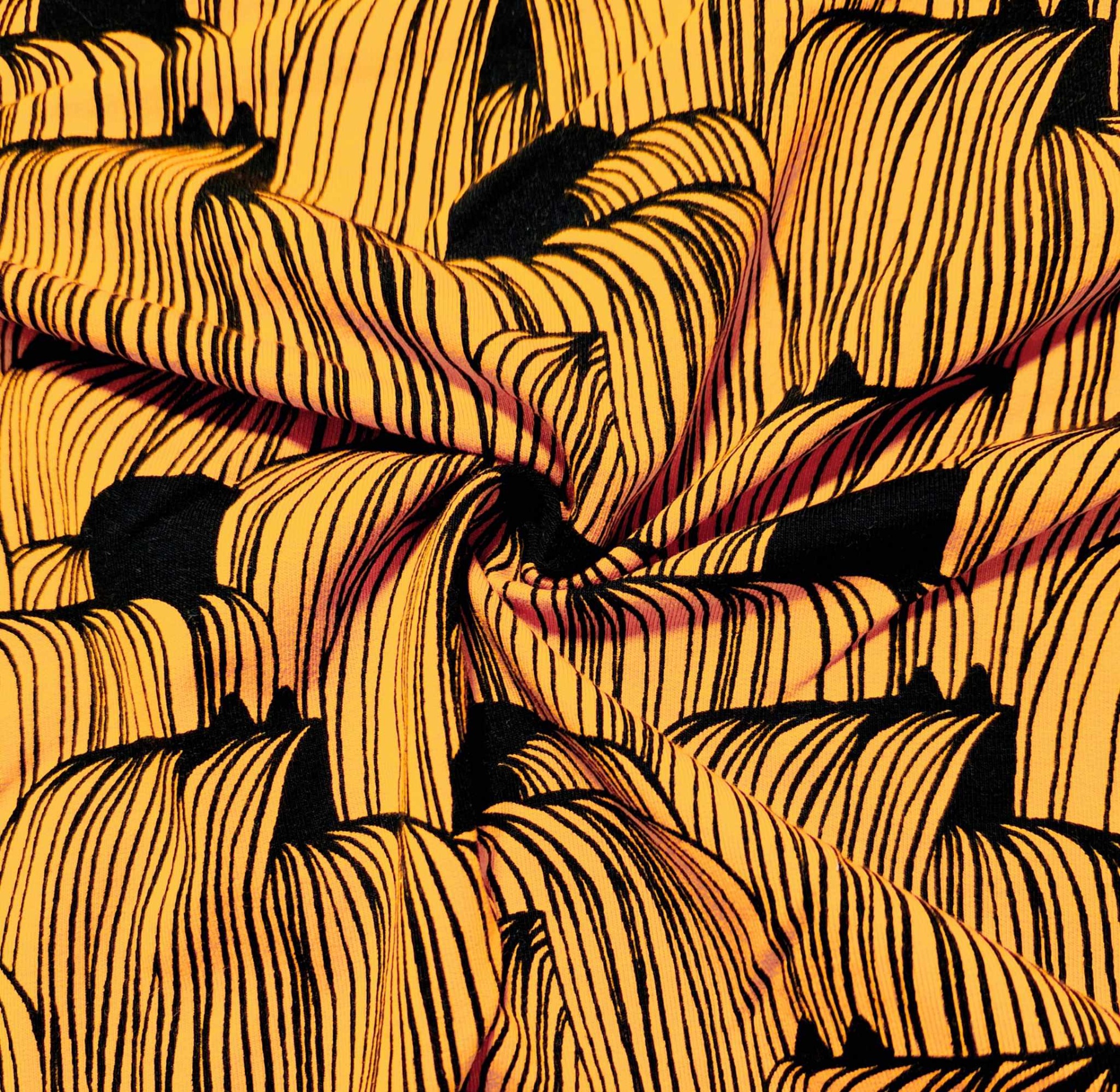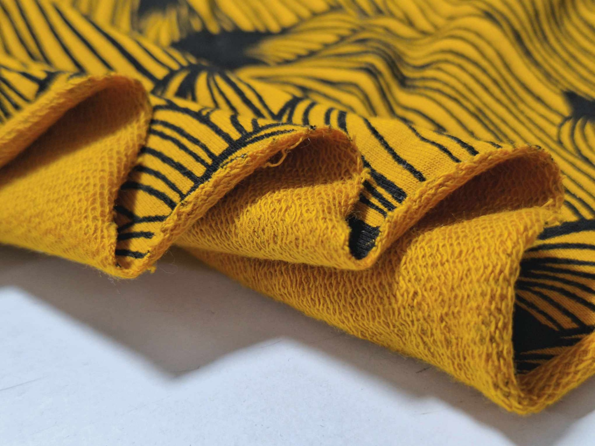 Malha com boa elasticidade, tom mostarda com estampado em tom preto