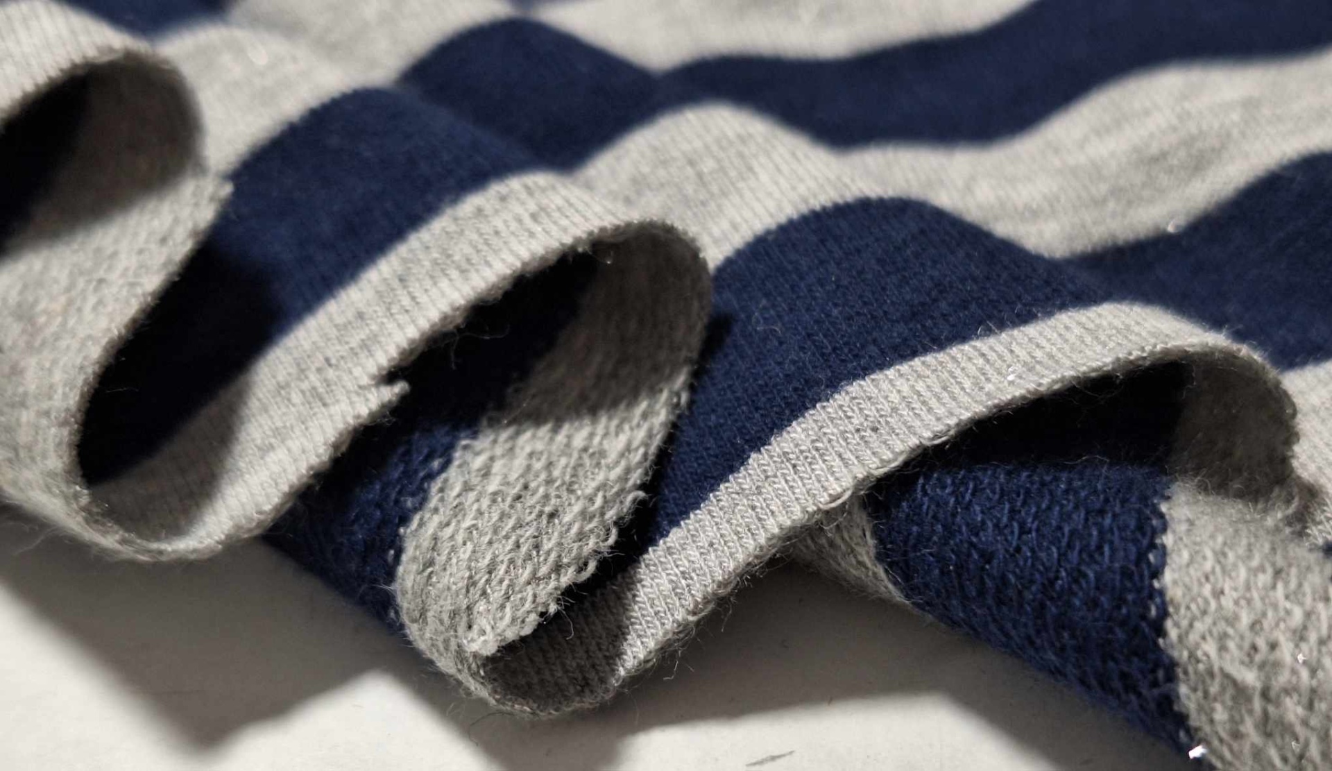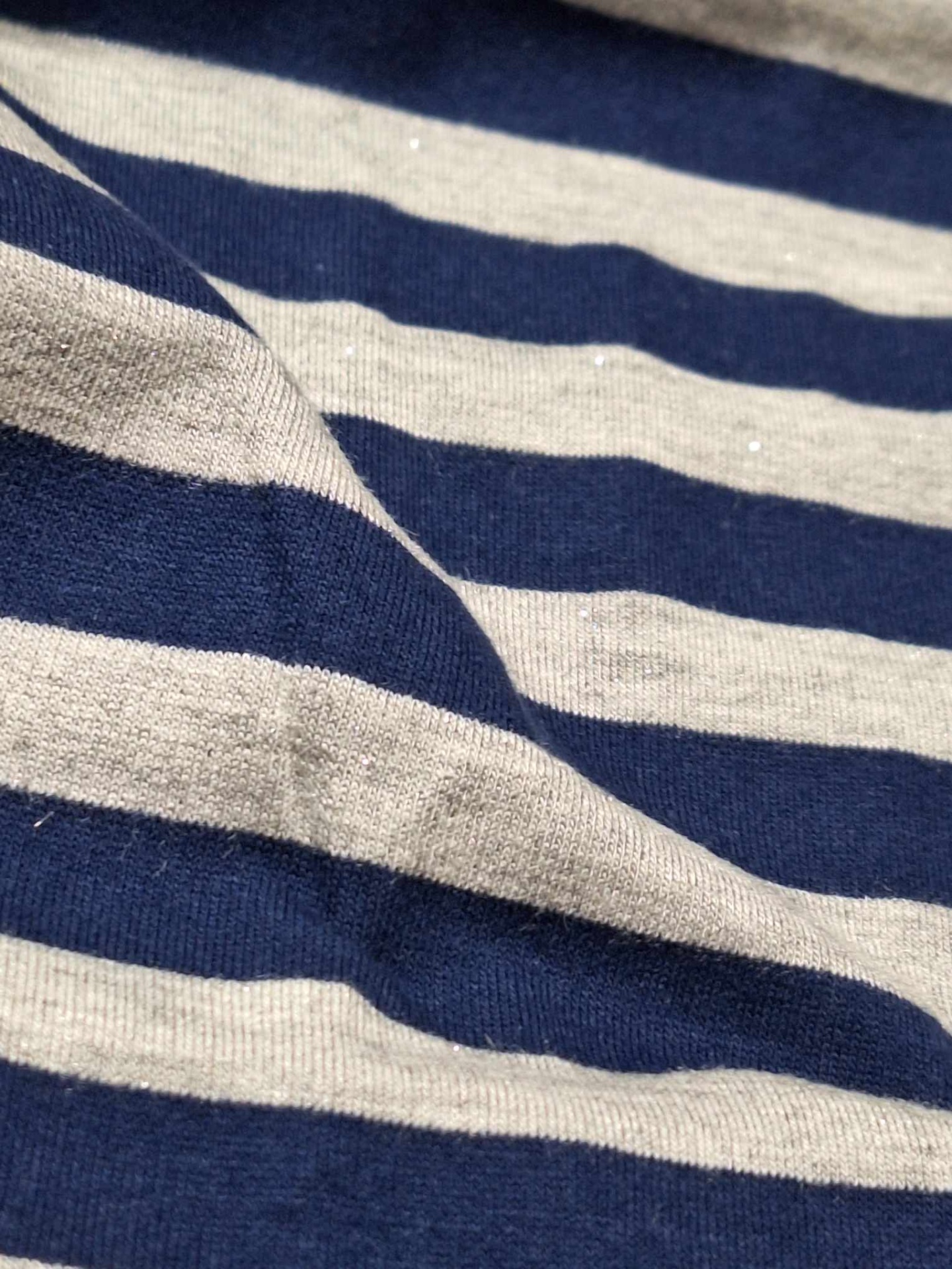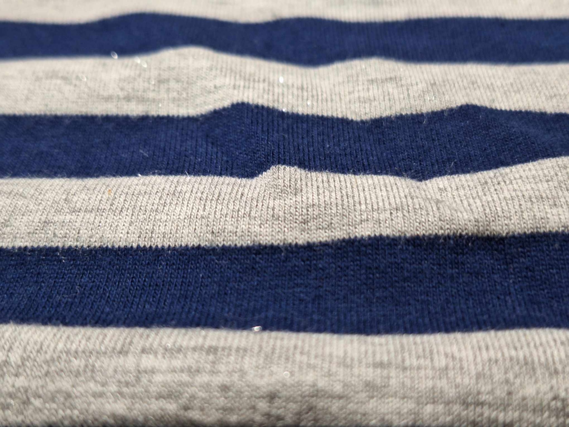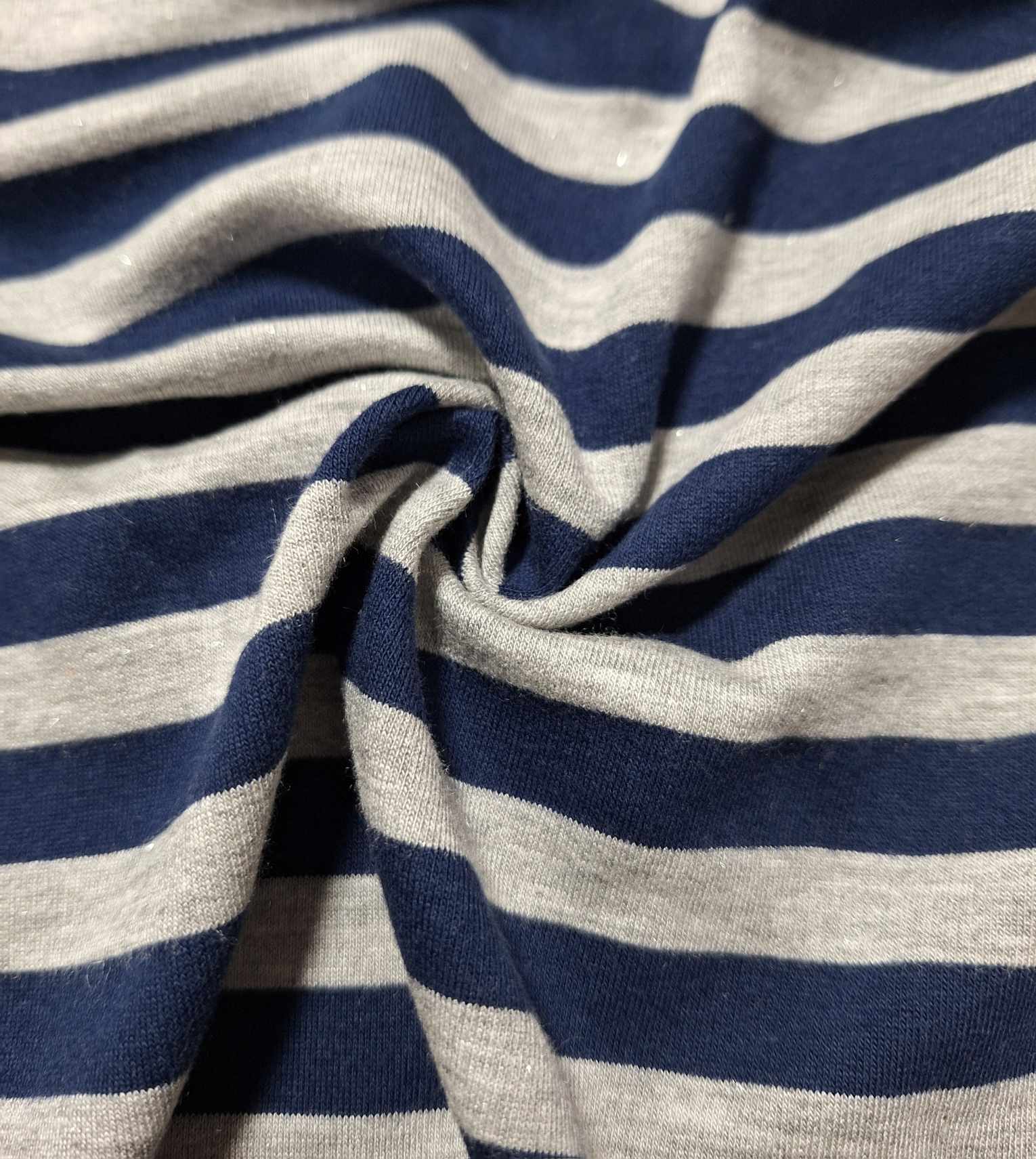 Malha fresca, boa elasticidade, tom marinho e cinza, malha com brilho ligeiro, listas na horizontal