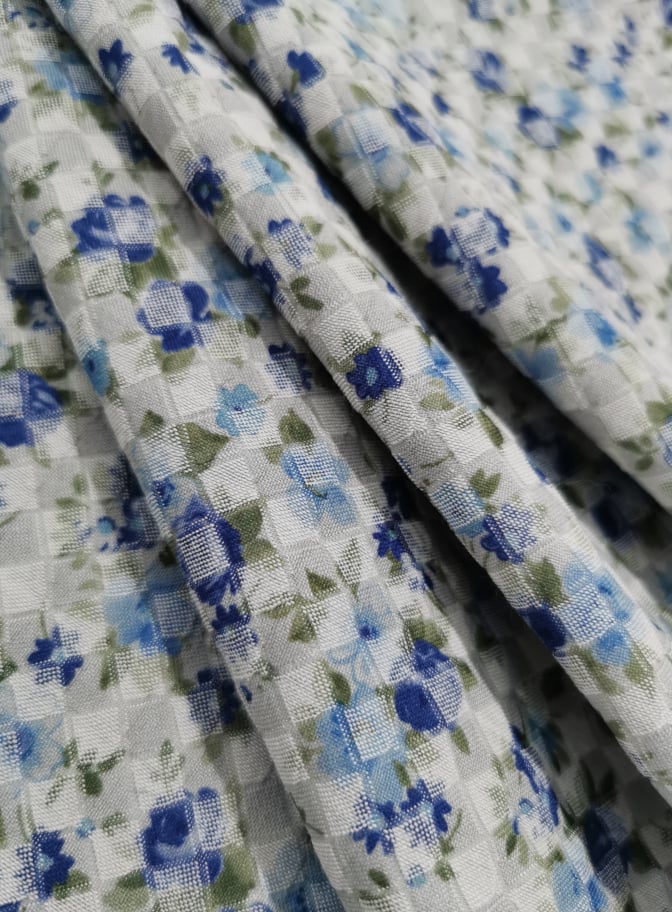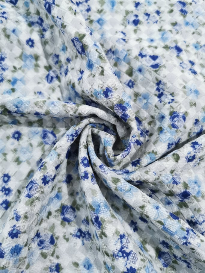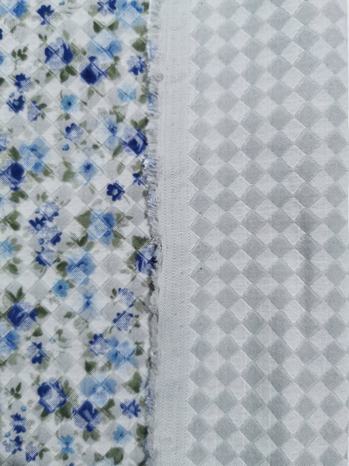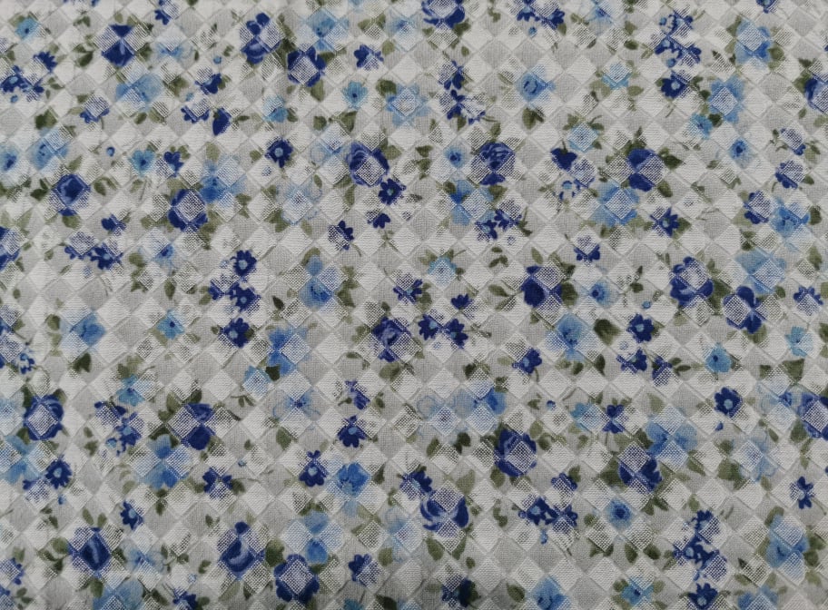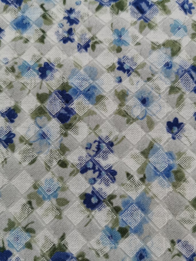 tecido fresco, resistente, sem elasticidade, flexivel, com padrão geometrico em losangos e estampado floral.