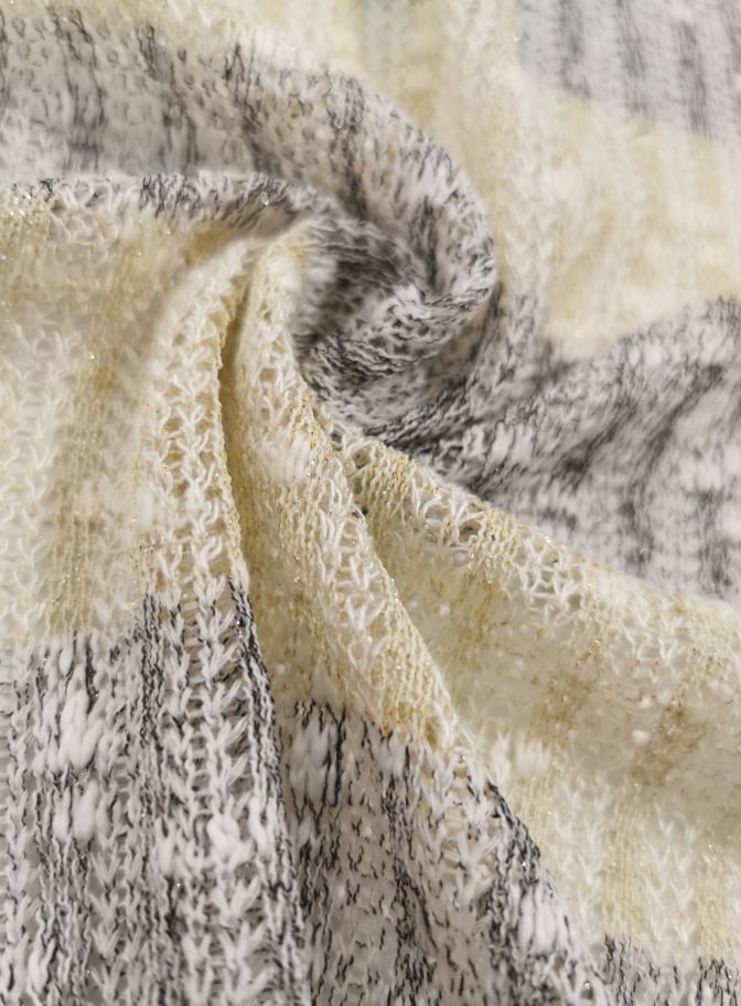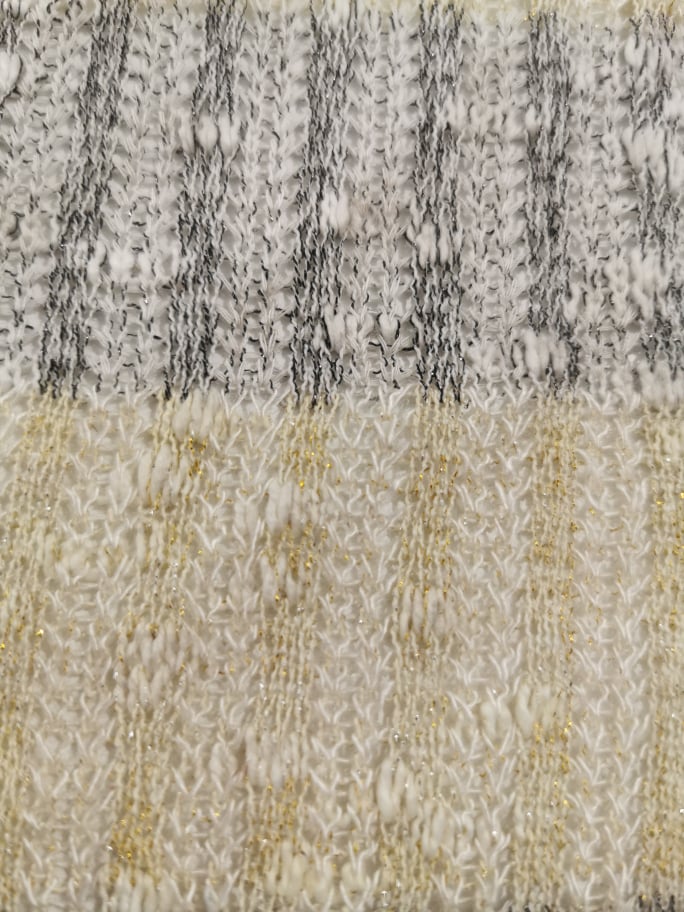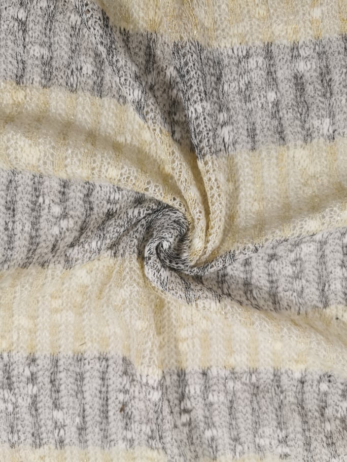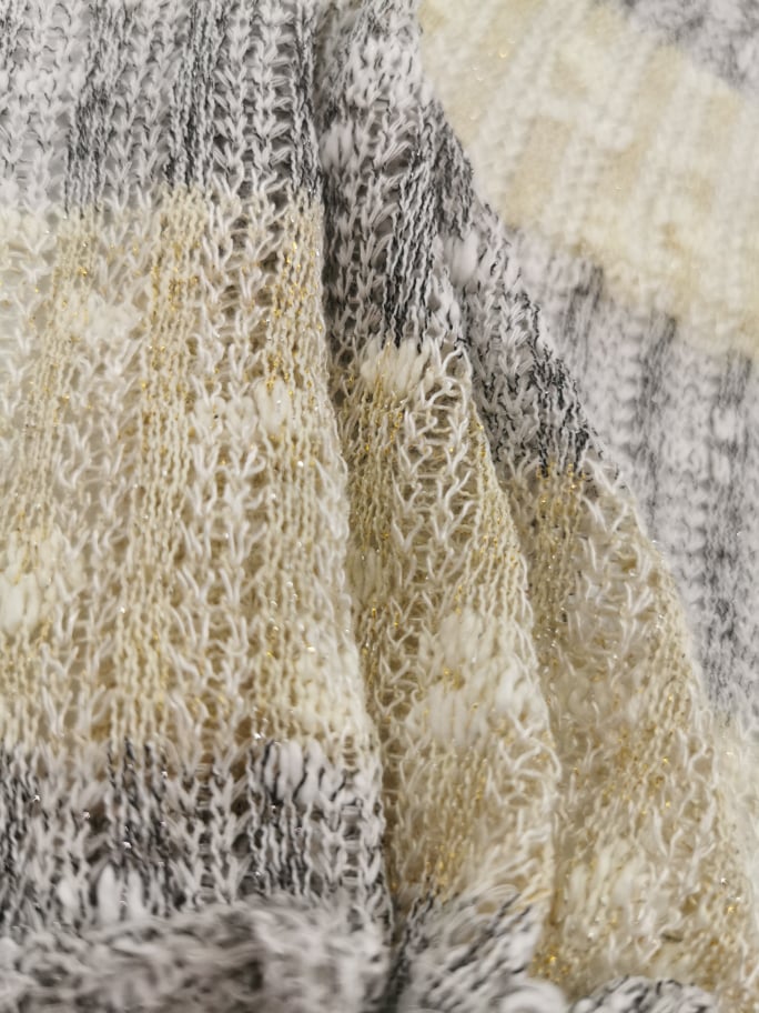 Malla con rayas blancas, beige y gris oscuro. Con brillo (plata y dorado) y transparencia, muy perforada.