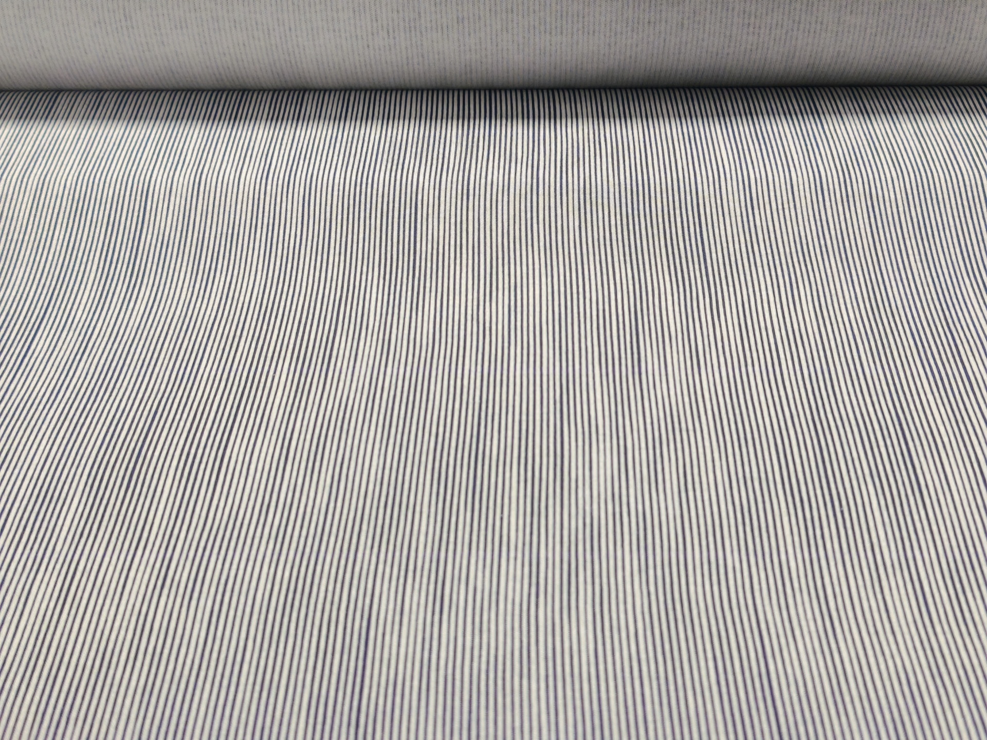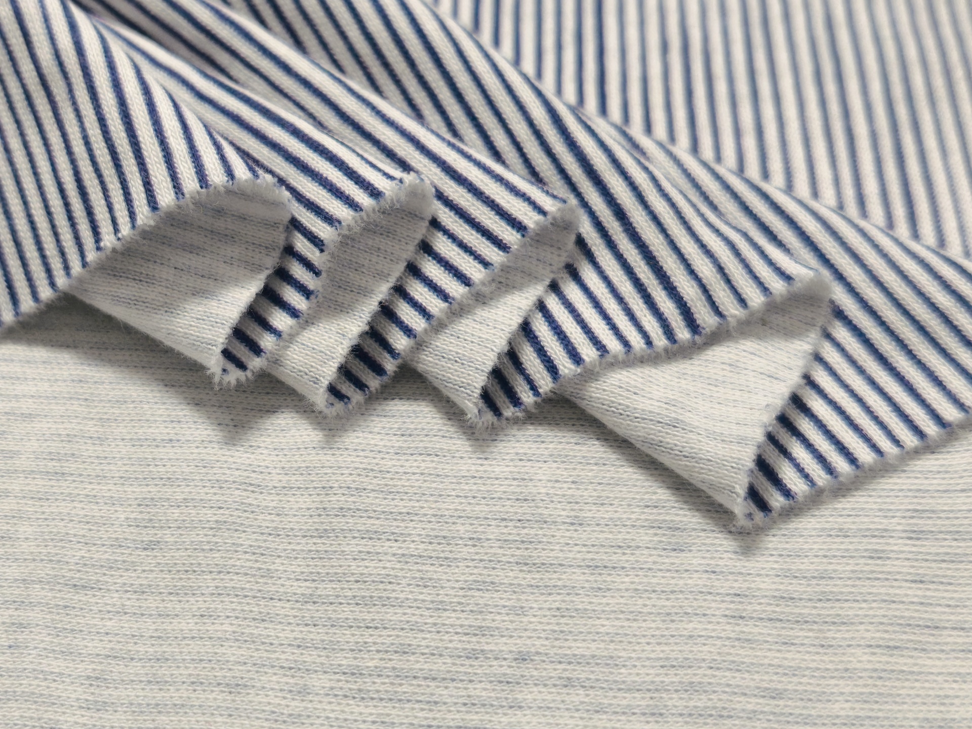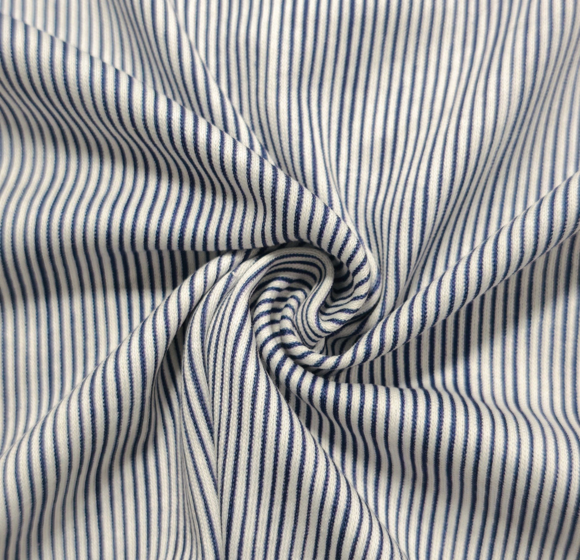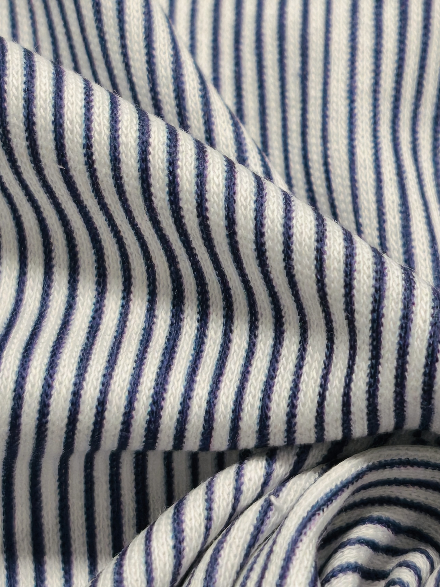 Malha com listras na vertical com cerca de 2mm de espessura nos tons azul e branco