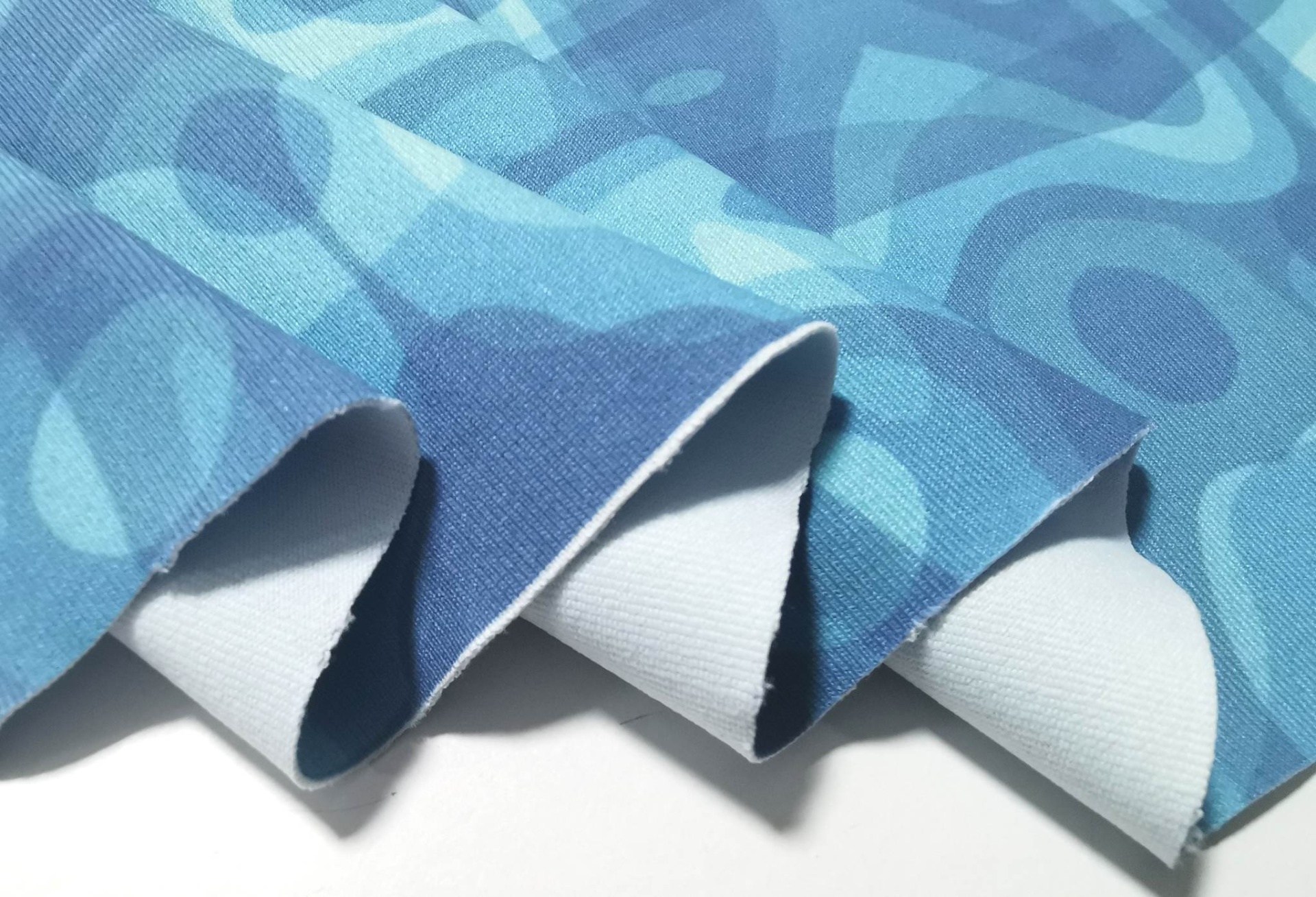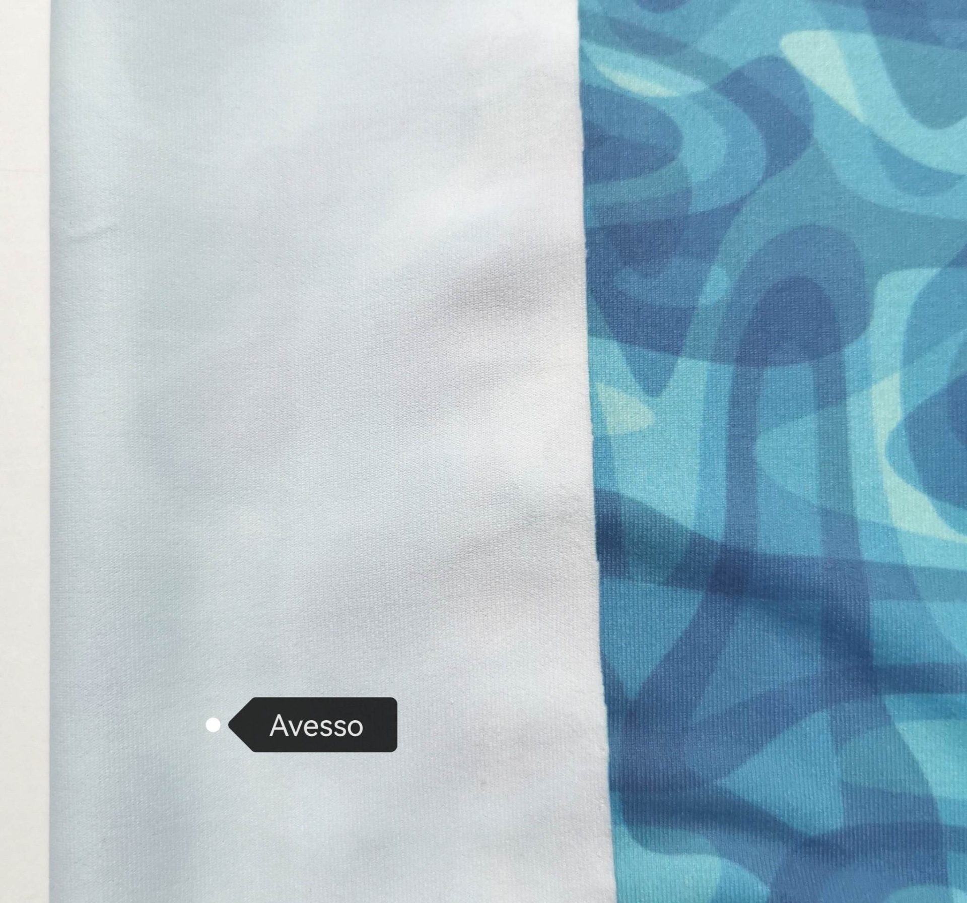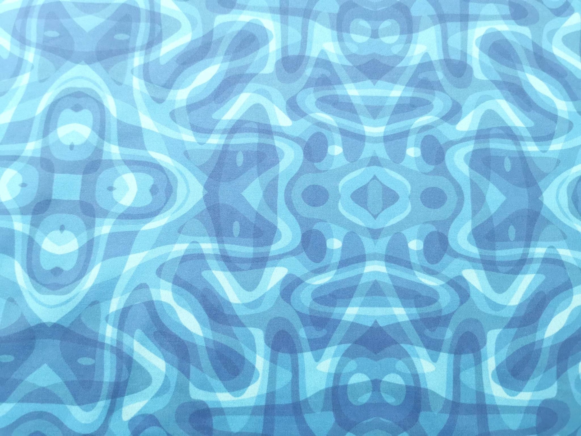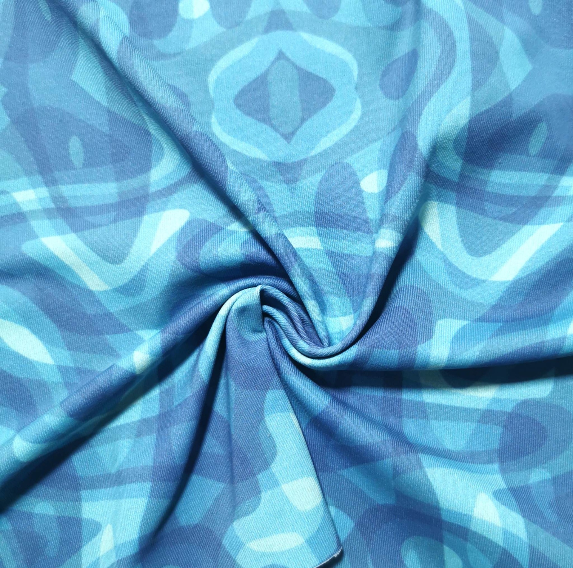 Malla licra en tono azul verdoso con estampado en tonos azules y verdes agua.