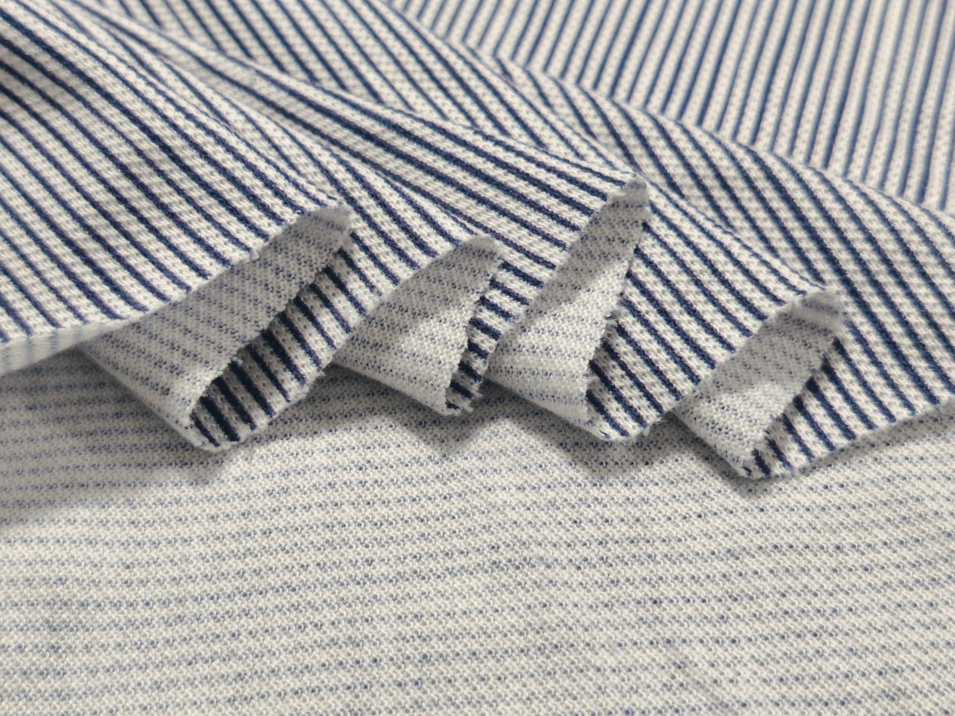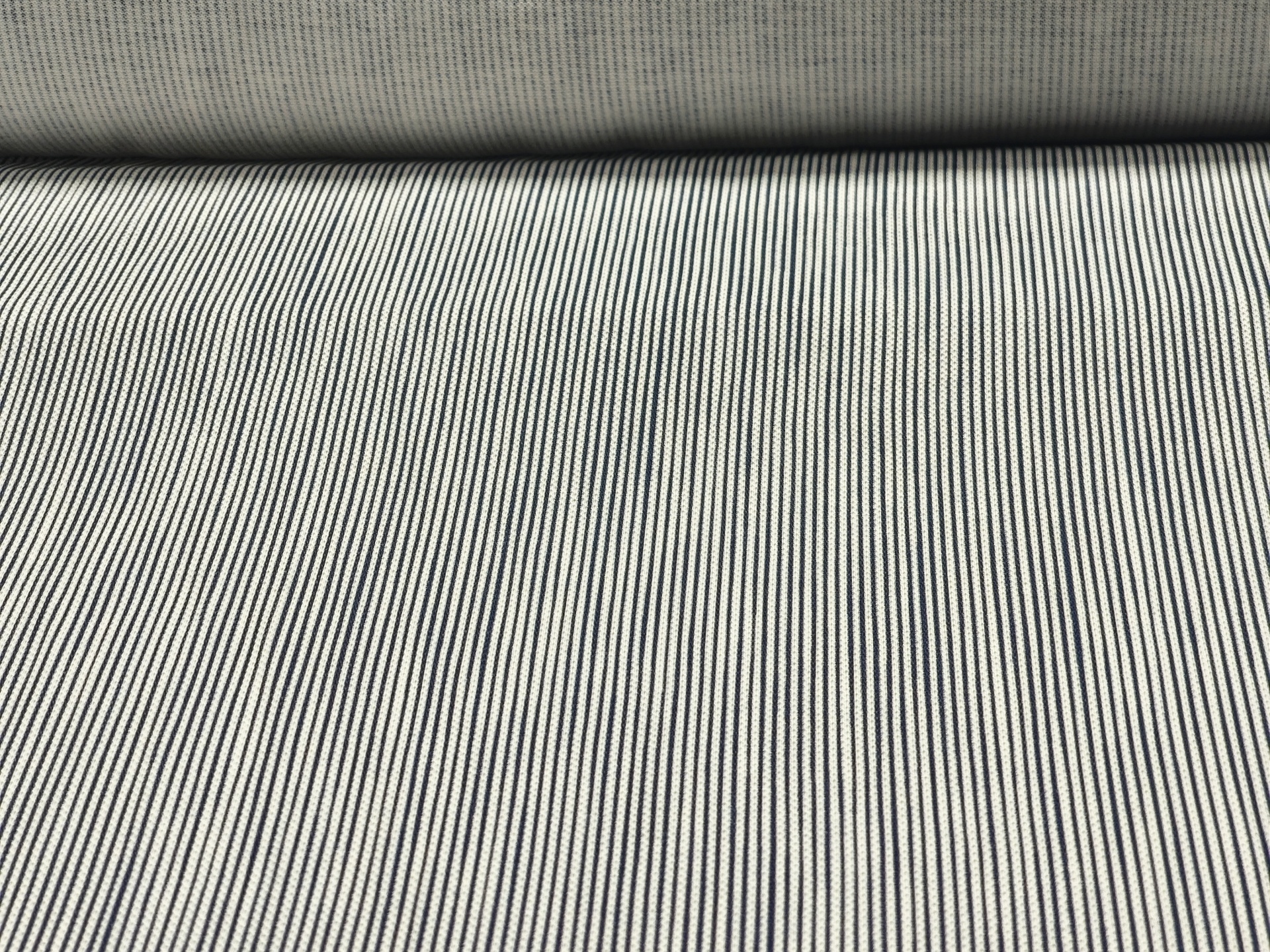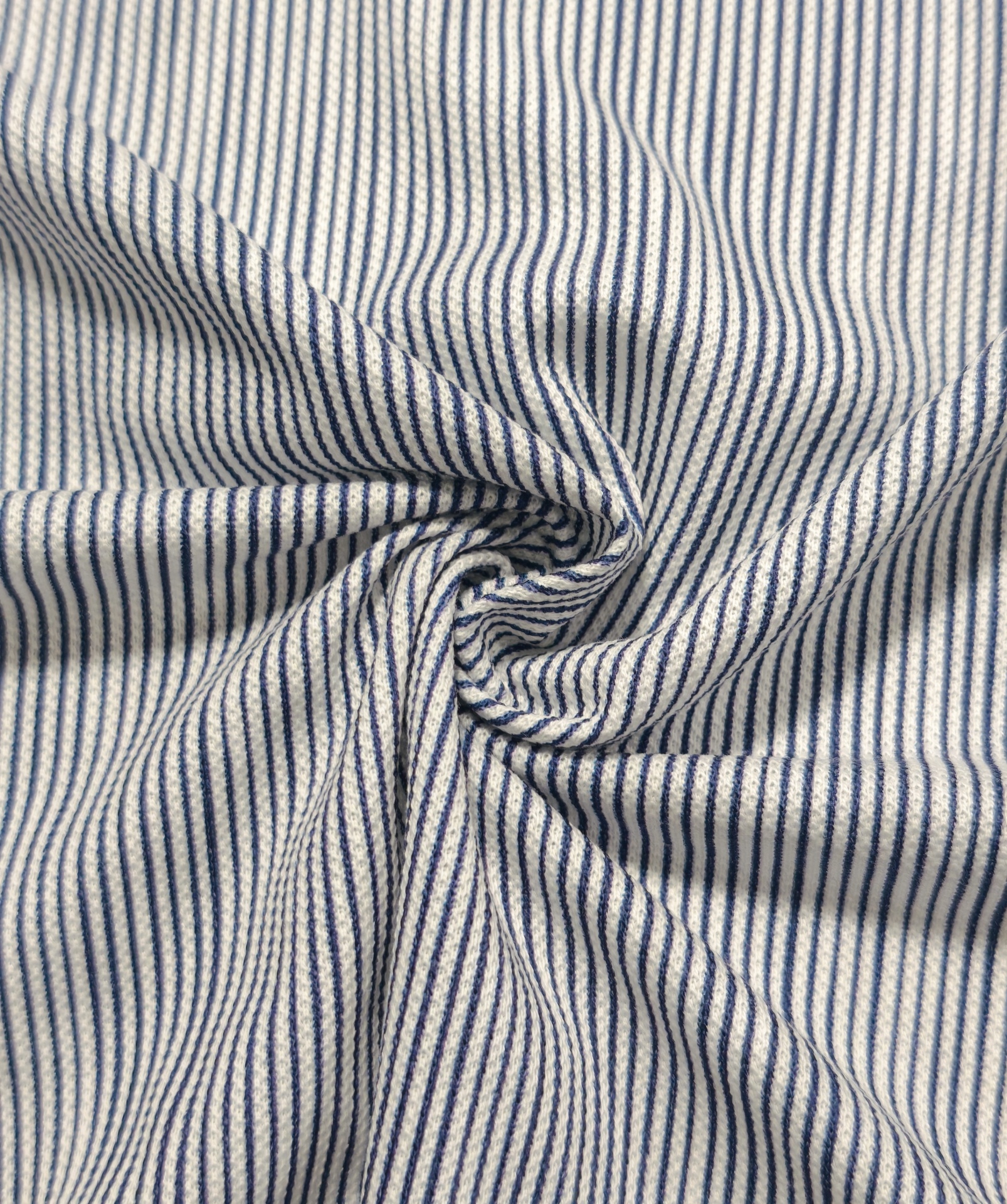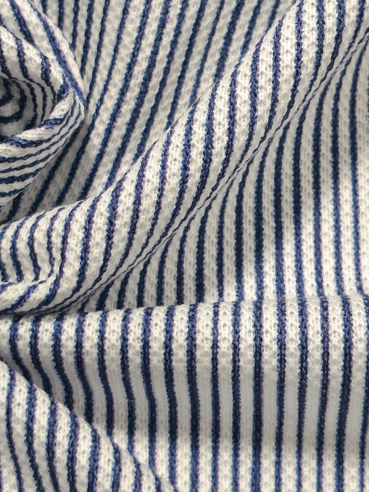 Malha com listras na vertical com cerca de 2mm de espessura nos tons azul escuro e branco