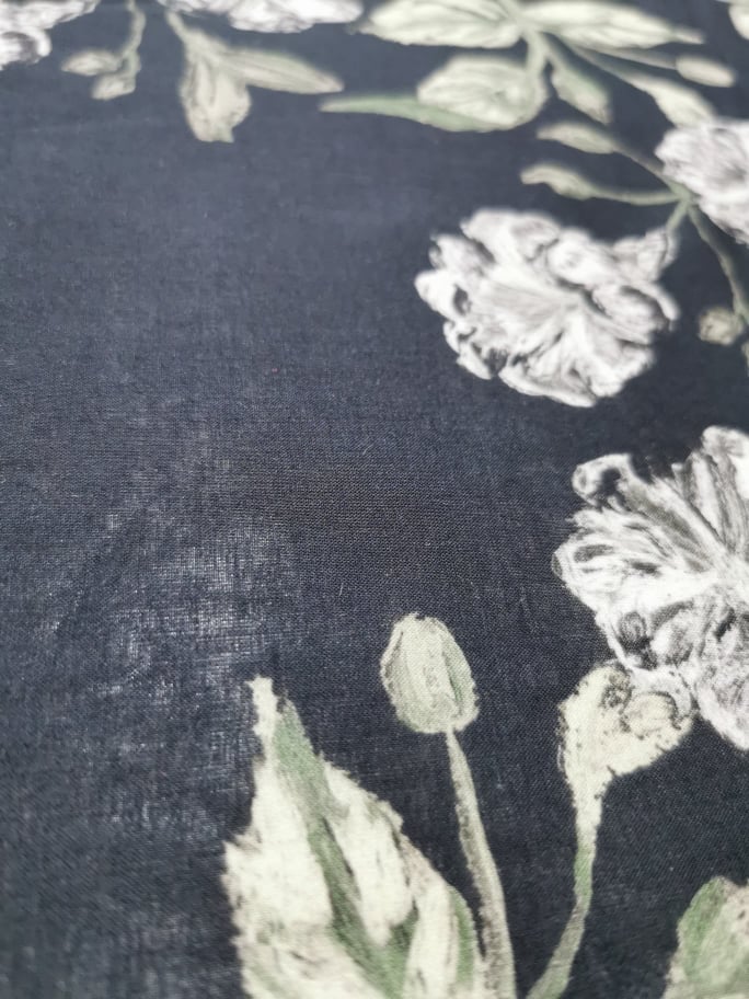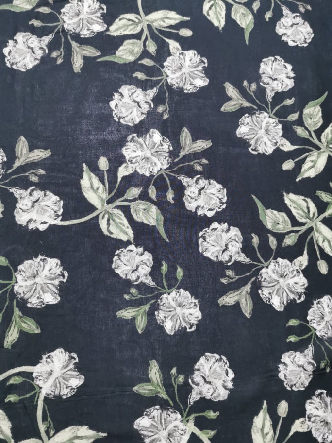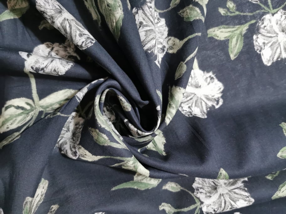 tecido fresco, leve, confortável, cor de fundo marinho,fores brancas, e tons de verde