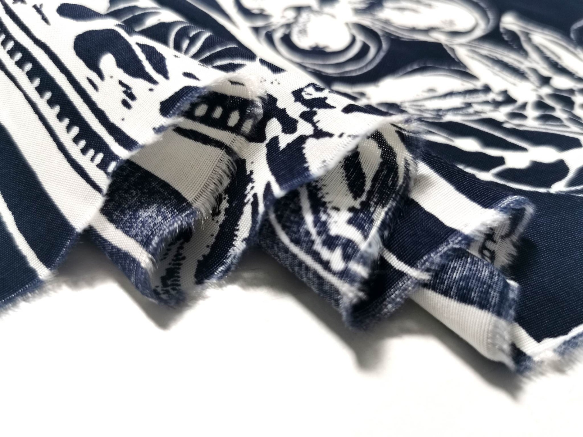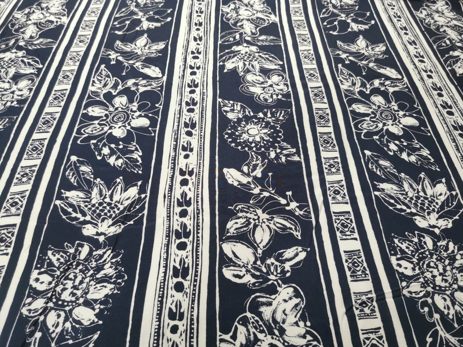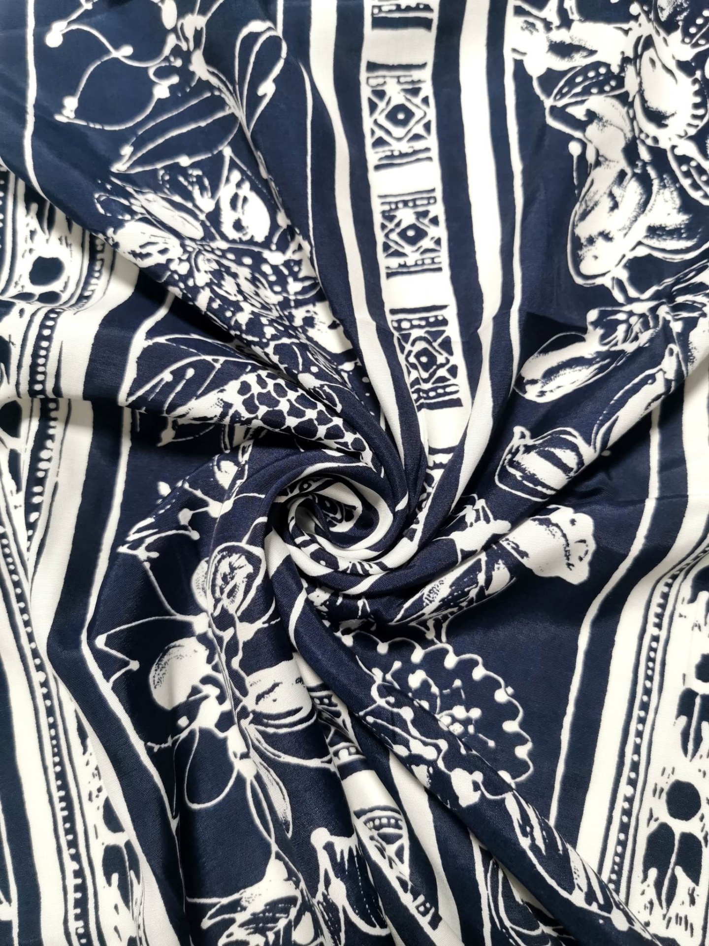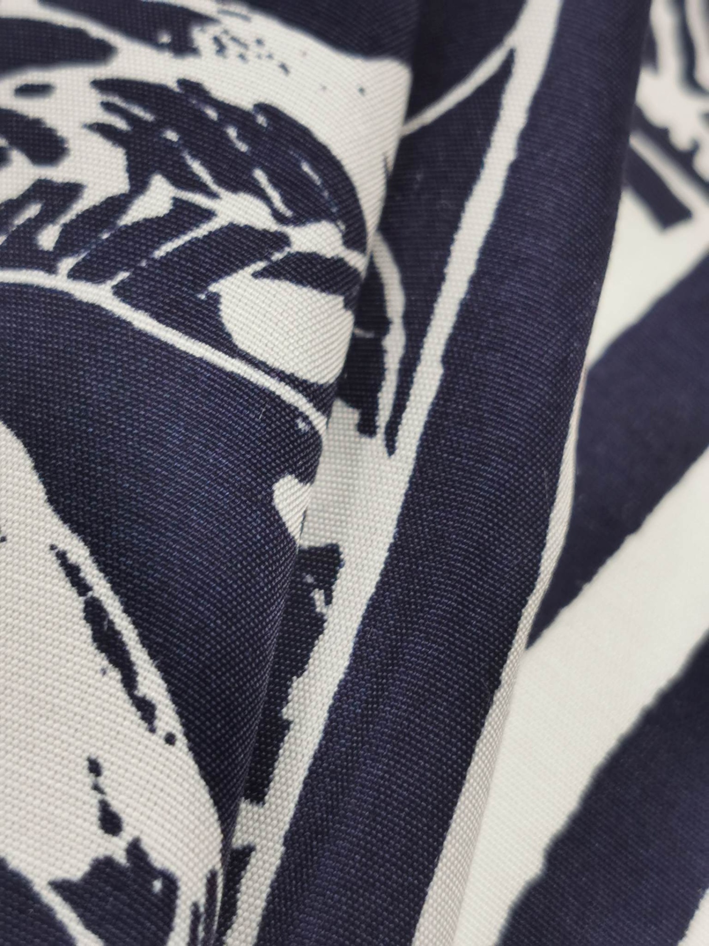 Tecido nos tons marinho e branco, muito agradável, bom caimento, fresco e fluido