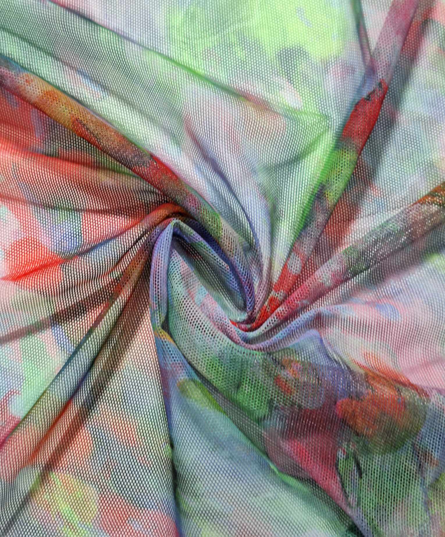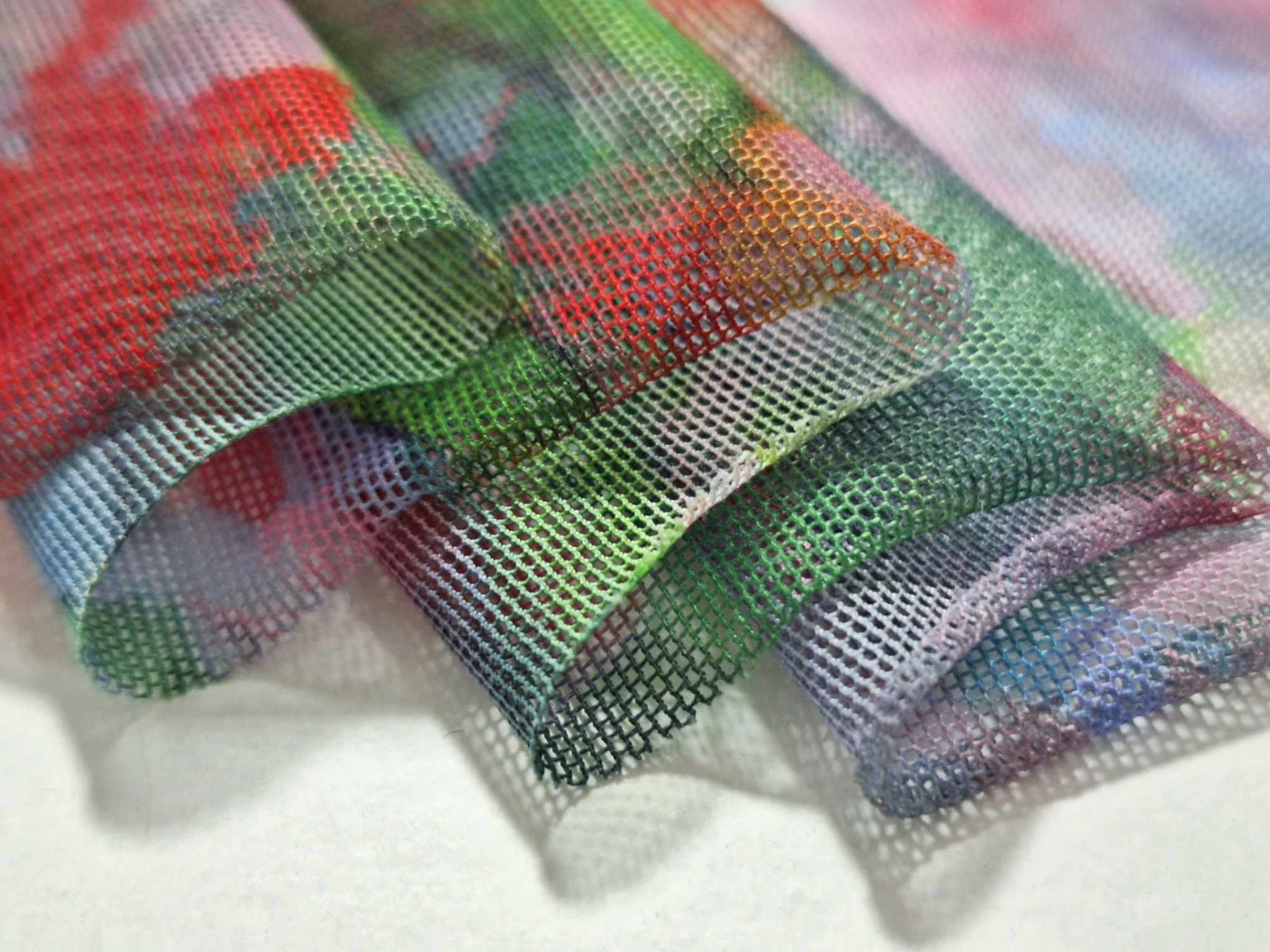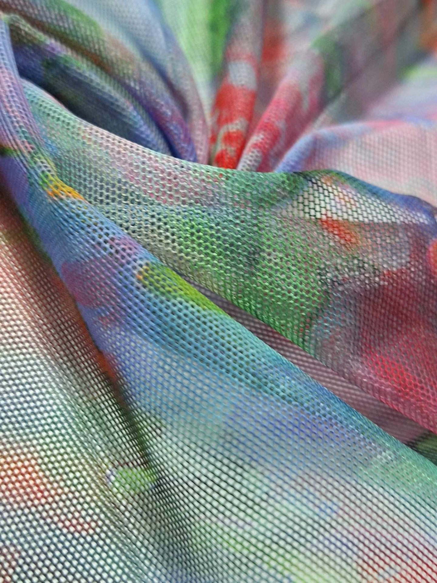 Tejido de malla estampado, transparente, ligero, con elastano, estampado de colores, sin brillo.