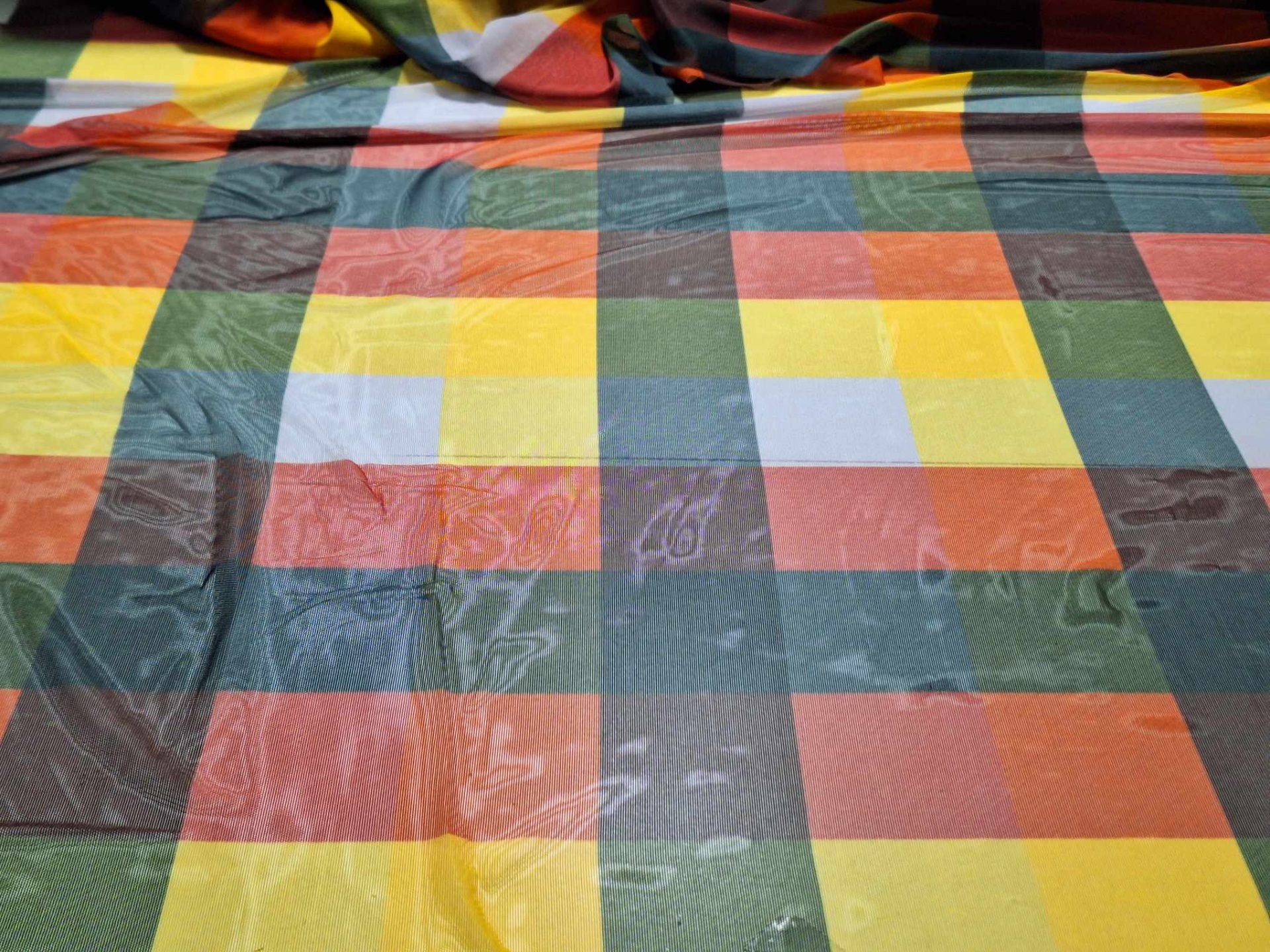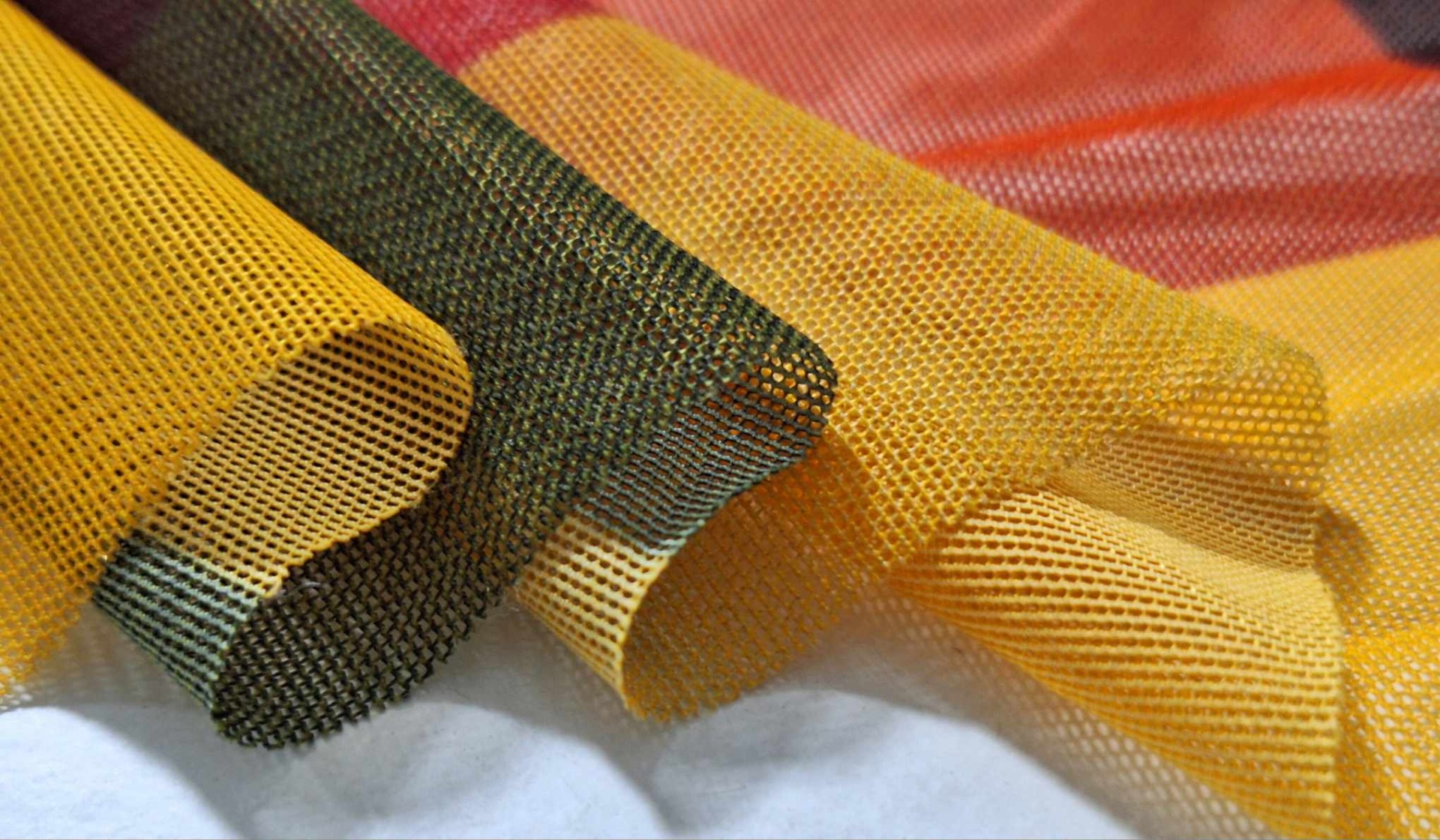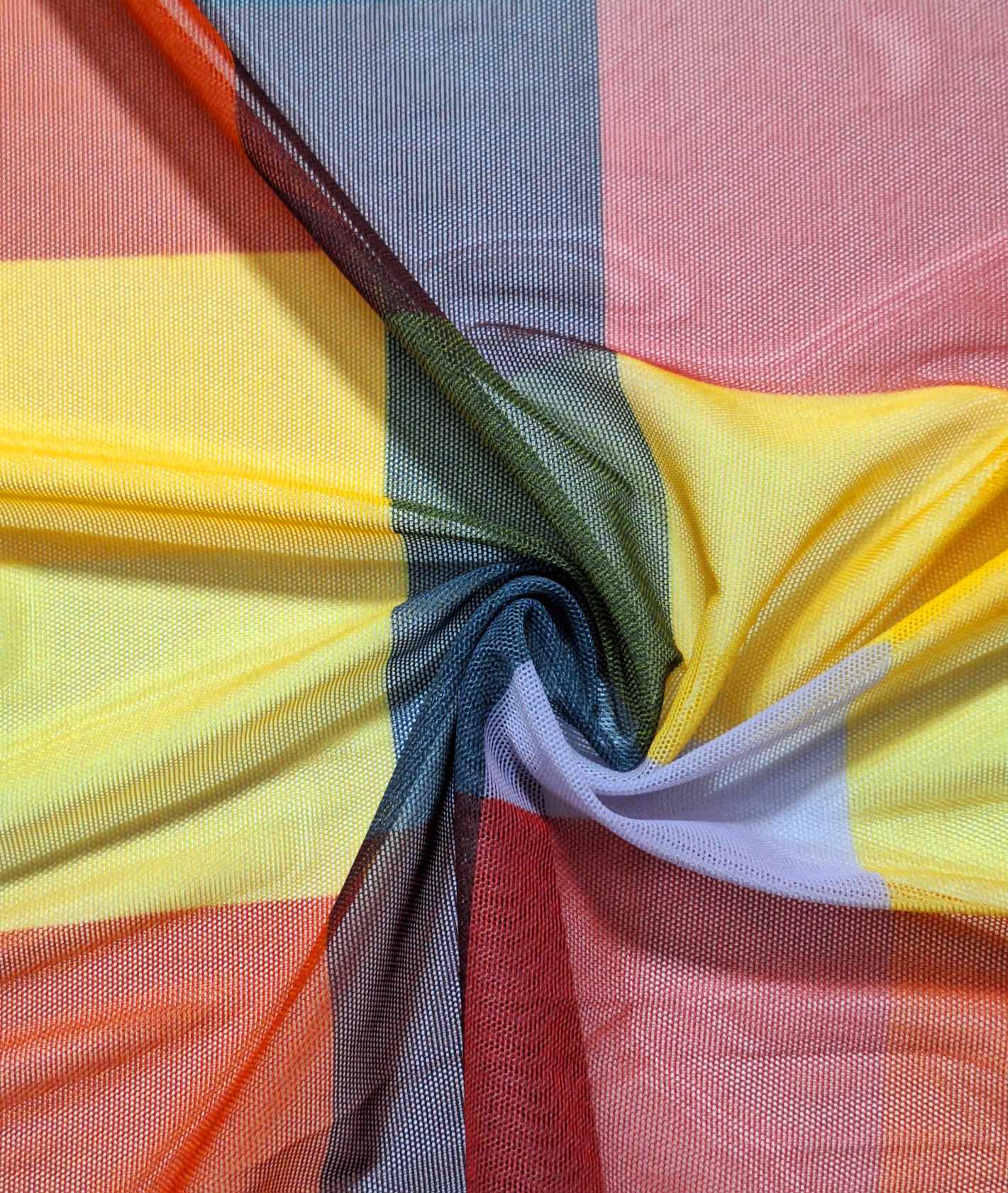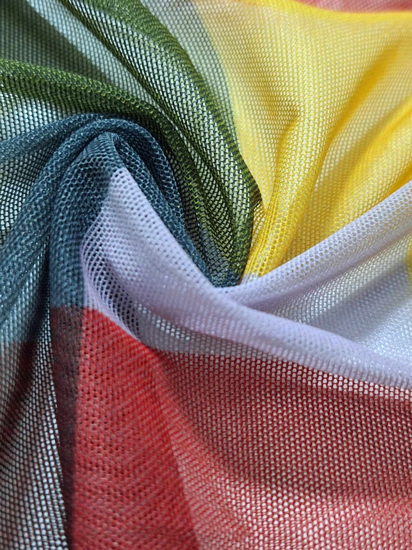Tejido de malla estampado, transparente, ligero, con elastano, estampado de colores, sin brillo.