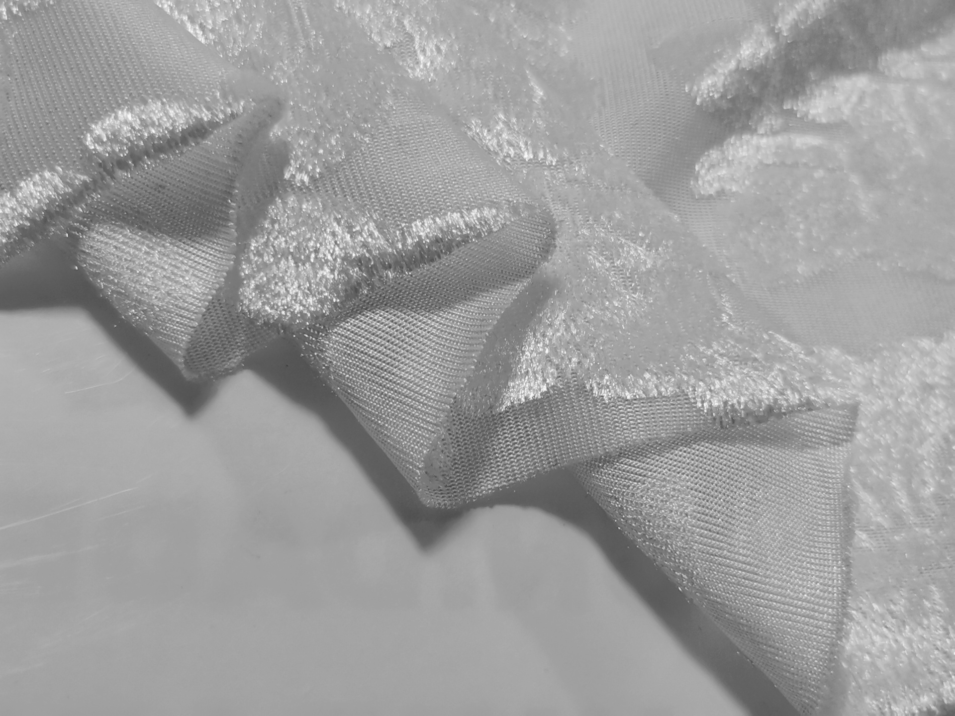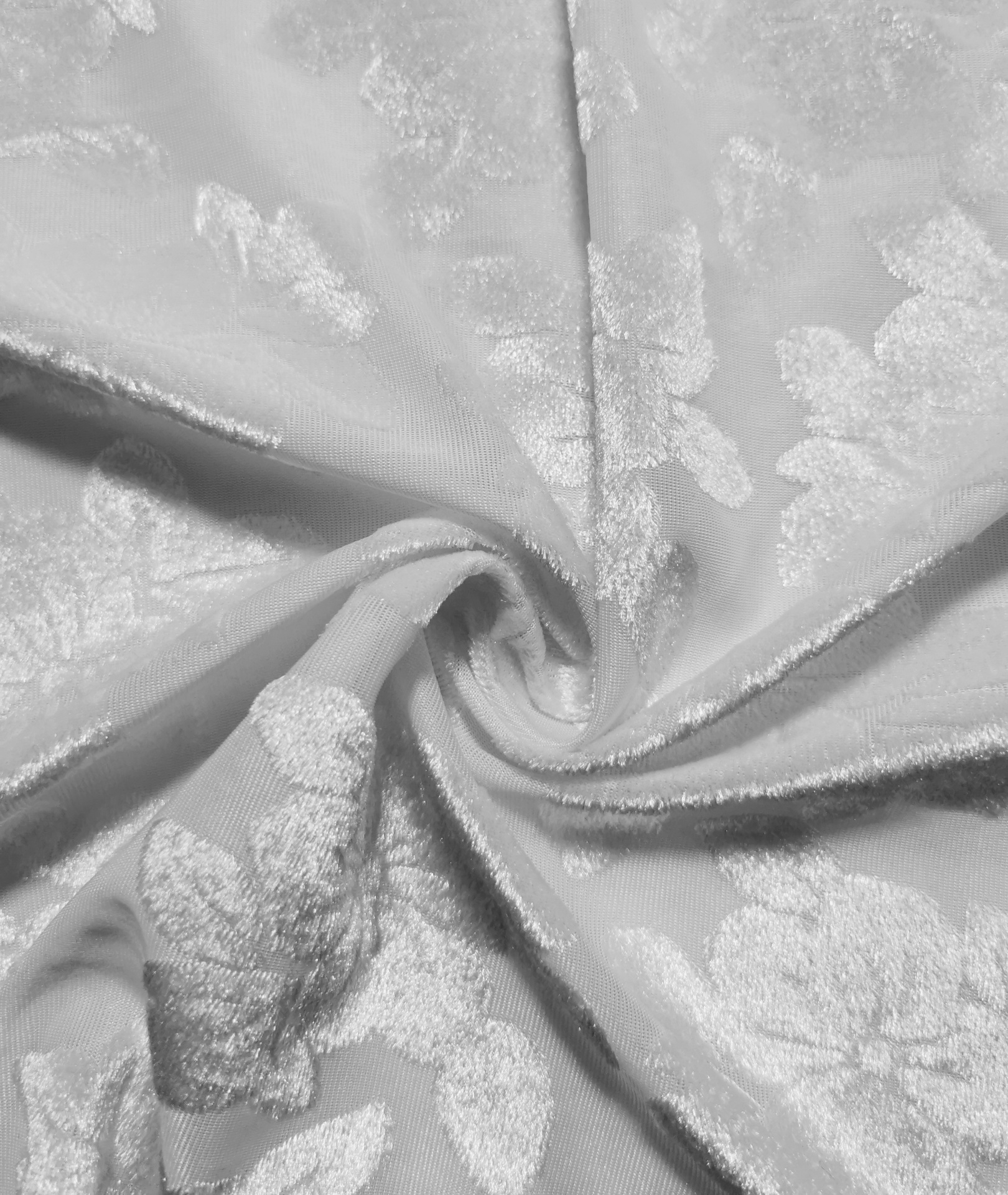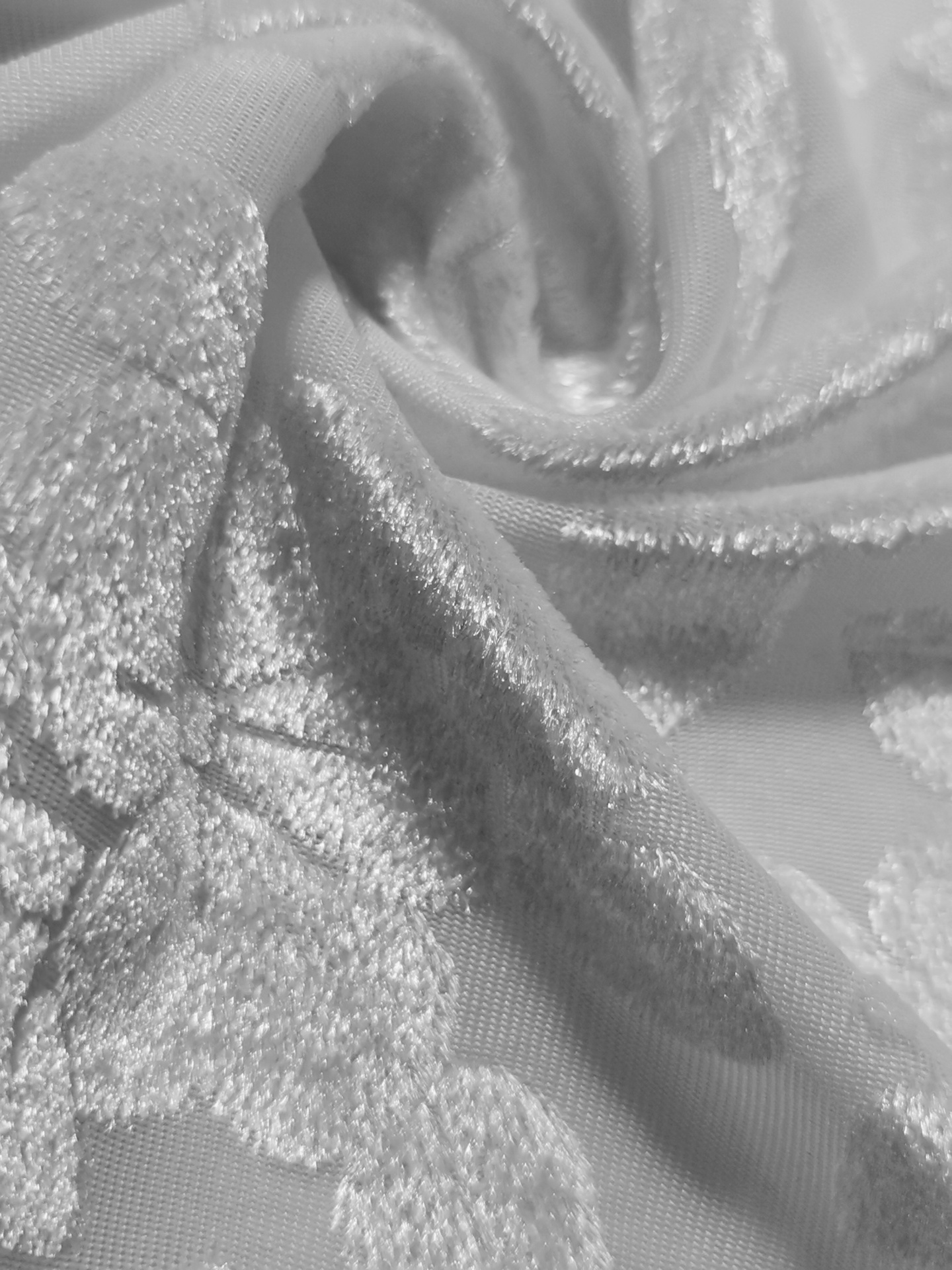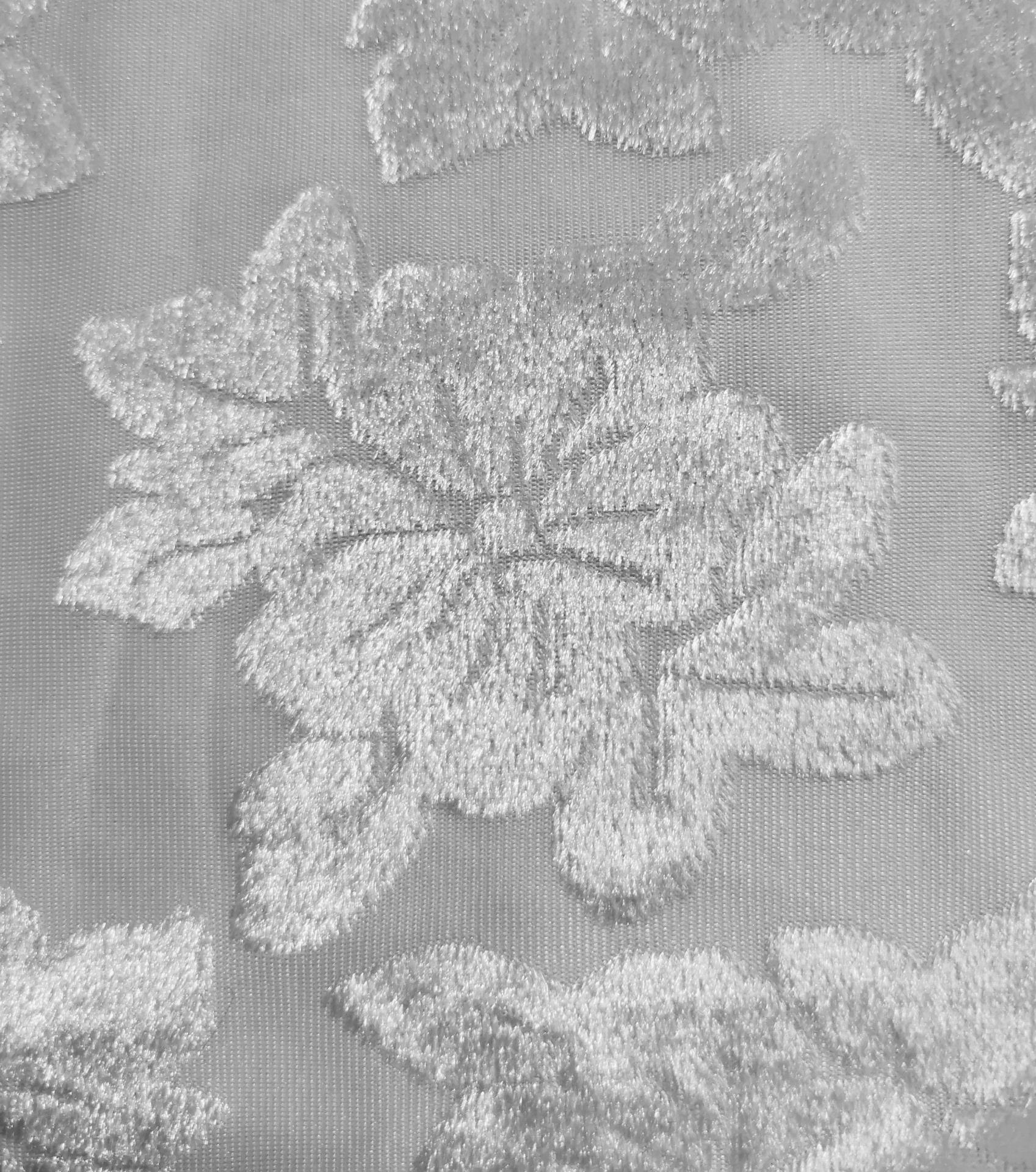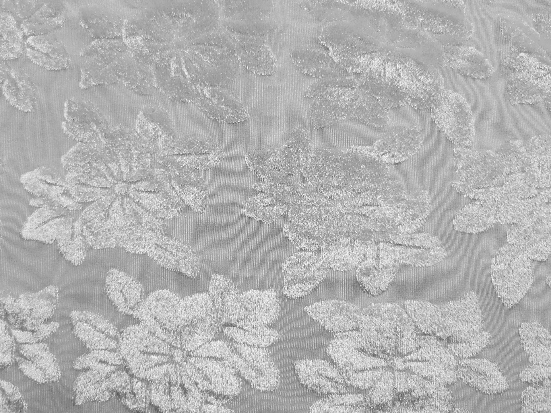 Malha com boa elasticidade em ambos os sentidos, flores em relevo veludo, muito confortável e bom caimento